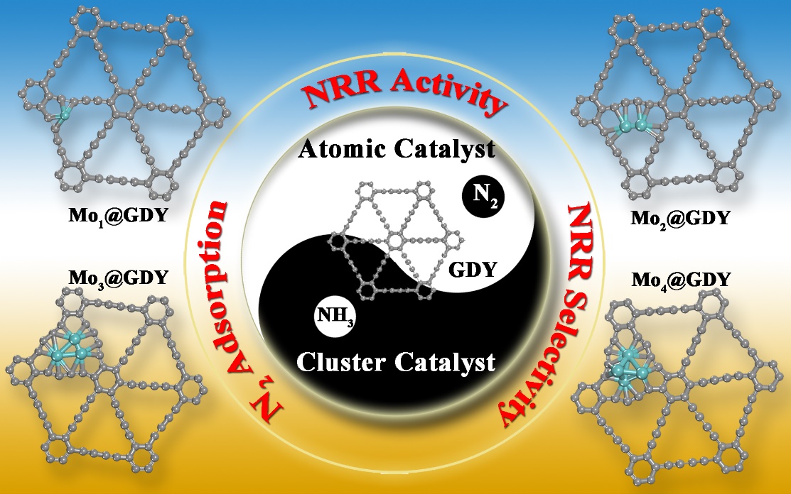 黄玉成课题组在前期对二维GaSe材料的缺陷尺寸工程影响NRR性能做了充分研究后(Inorg. Chem. 2020, 59, 4858),近日又基于密度泛函理论的计算和模拟,系统地研究了石墨炔(GDY)上负载的Mox(x=1−4)催化的NRR催化性能。结果表明,N2通过“接受−捐赠”机制被有效地吸附在衬底上,这一机制可通过N2的吸附吉布斯自由能与Mo−N和N-N的键长或相应的ICOHP值之间的良好多元线性回归来深入理解。根据设计的筛选标准,发现Mo3@GDY对NRR具有较高的选择性和稳定性。预测的起始电位仅−0.32V。与单原子、双原子和四原子催化剂相比,三原子金属团簇催化剂的优越电催化性能将为探索新一代电化学催化剂提供机遇。这一研究成果以“Screening a Suitable Mo Form Supported on Graphdiyne for Effectively Electrocatalytic N2 Reduction Reaction: From Atomic Catalyst to Cluster Catalyst”为题发表在化学领域期刊《物理化学快报》上(J. Phys. Chem. Lett., 2020, 11, 8128)。