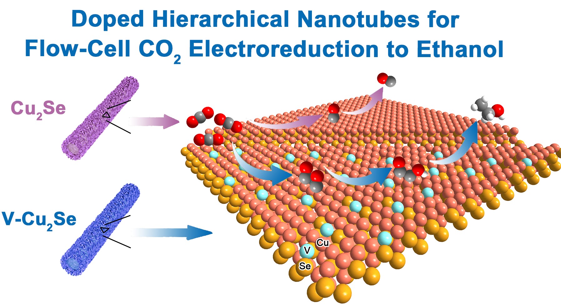 近日,公司熊宇杰副董事长和英国正版365官方网站吴正翠教授、盛天副教授合作在流动池电催化二氧化碳转化材料研究领域取得重要进展。该成果以“V-Doped Cu2Se Hierarchical Nanotubes Enabling Flow-Cell CO2 Electroreduction to Ethanol with High Efficiency and Selectivity”为题发表在国际材料类顶刊Advanced Materials上(原文链接: https://doi.org/10.1002/adma.202207691)。