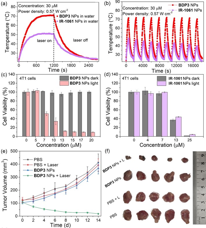 光热疗法(PTT)是利用光敏剂在近红外(NIR)光照射下产生足够的热量来杀死肿瘤细胞并诱导抗肿瘤免疫,具有高选择性和低侵入性等特点,已成为一种有希望的有效癌症治疗方法。近红外吸收有机小分子可以在光子的激发下,通过分子内的非辐射跃迁途径产生热量而杀死肿瘤细胞,具有易于修饰、衍生、副作用小等特点,被认为是潜在的光热试剂。然而,目前常见的具有超过800 nm吸收波长的有机小分子光热剂的设计方法通常为:构建大的共轭体系和引入推拉电子结构。这种分子设计策略通常会导致近红外染料的。
