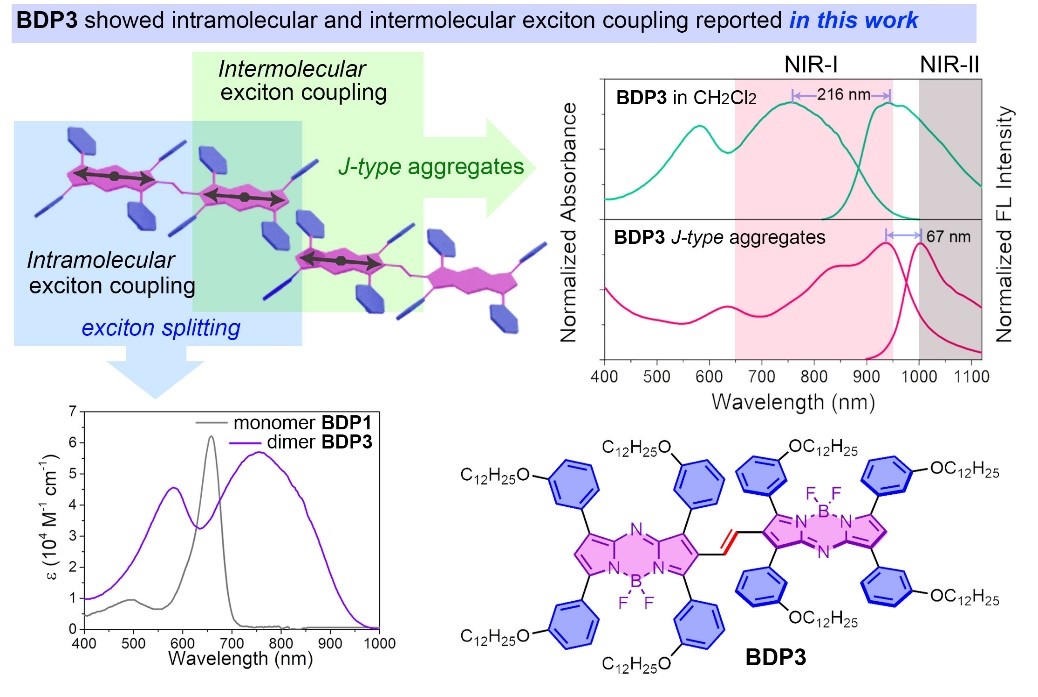 作者构建的乙烯基桥联的aza-BODIPY二聚体发色团,由于其组成单体间的“偶极-偶极”相互作用其展现出强烈的分子内激子耦合,表现为吸收谱带的裂分和红移,并通过DFT计算、圆二色谱以及循环伏安法验证其分子内激子耦合的存在。而对其经过三嵌段共聚物F-127封装时,J-聚集体的形成使得其吸收和发射光谱的进一步红移(分别达到936 nm和1003 nm),同时也验证了其分子间激子耦合的存在。