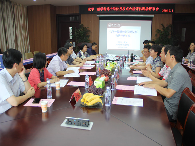 7月4日,英国正版365官方网站化学一级学科博士学位授权点合格评估现场评审会在理科实训大楼702会议室举行。国务院学位委员会化学学科评议组成员、南京大学郭子建院士担任评估专家组组长、中科院上海有机化学研究所赵刚研究员,南京大学徐静娟教授、王新平教授,中国科学技术大学俞书宏教授、崔华教授、陈昶乐教授担任专家组成员。公司副董事长彭凤莲、研究生院副经理王昊、公司领导班子成员、院教授委员会负责人、化学博士学位点负责人及部分师生代表参加会议。