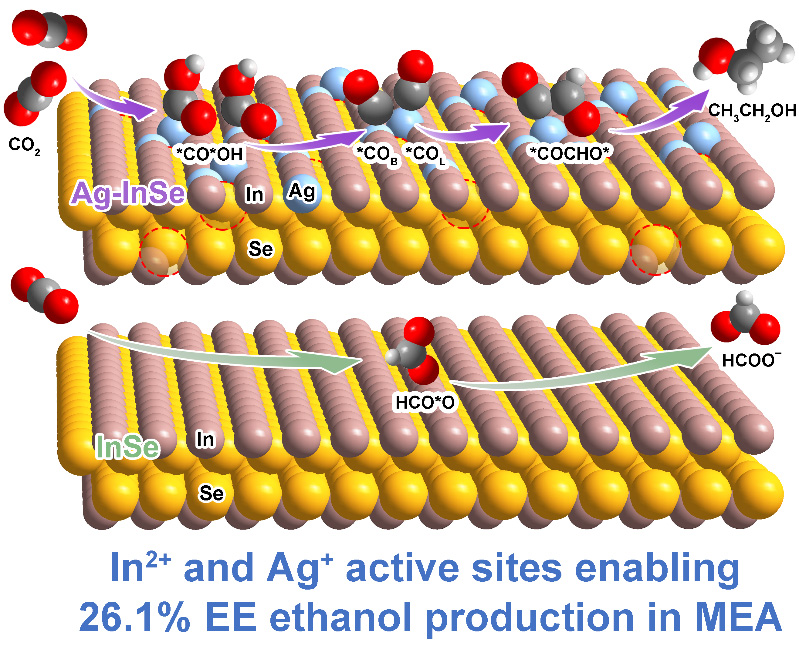 近日,公司熊宇杰副董事长和英国正版365官方网站吴正翠教授、盛天副教授合作在电催化CO2转化研究领域取得重要进展。该成果以“Ag+-Doped InSe Nanosheets for Membrane Electrode Assembly Electrolyzer toward Large-Current Electroreduction of CO2 to Ethanol”为题发表在国际化学类顶刊Angewandte Chemie International Edition上(原文链接:https://doi.org/10.1002/anie.202313646)。