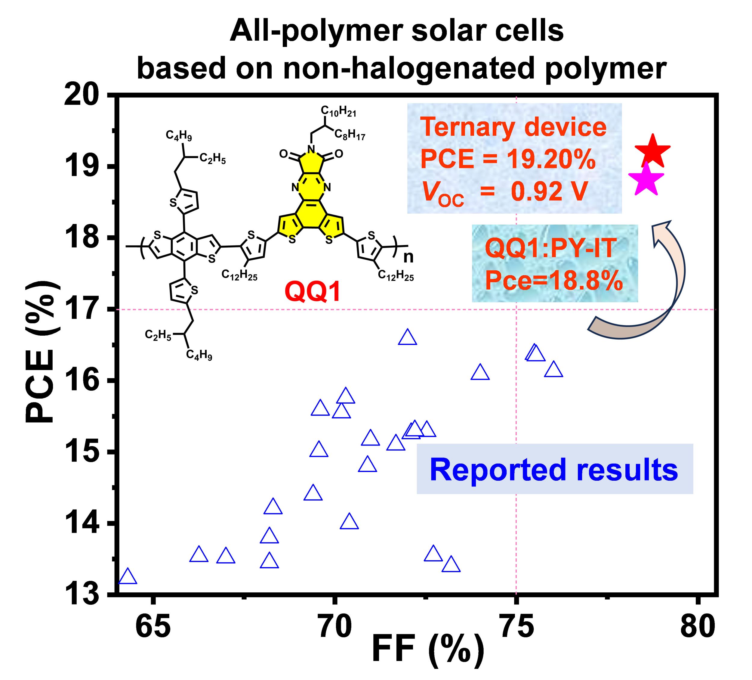 最终,基于QQ1:PT-IY的二元全聚合物太阳能电池实现了18.81%的能量转换效率,当引入经典高电压非富勒烯受体材料F-BTA3作为第三组份时,器件实现了19.20%的能量转换效率。这些结果为合理设计用于全聚合物太阳能电池的新型非卤聚合物给体提供了新的思路。