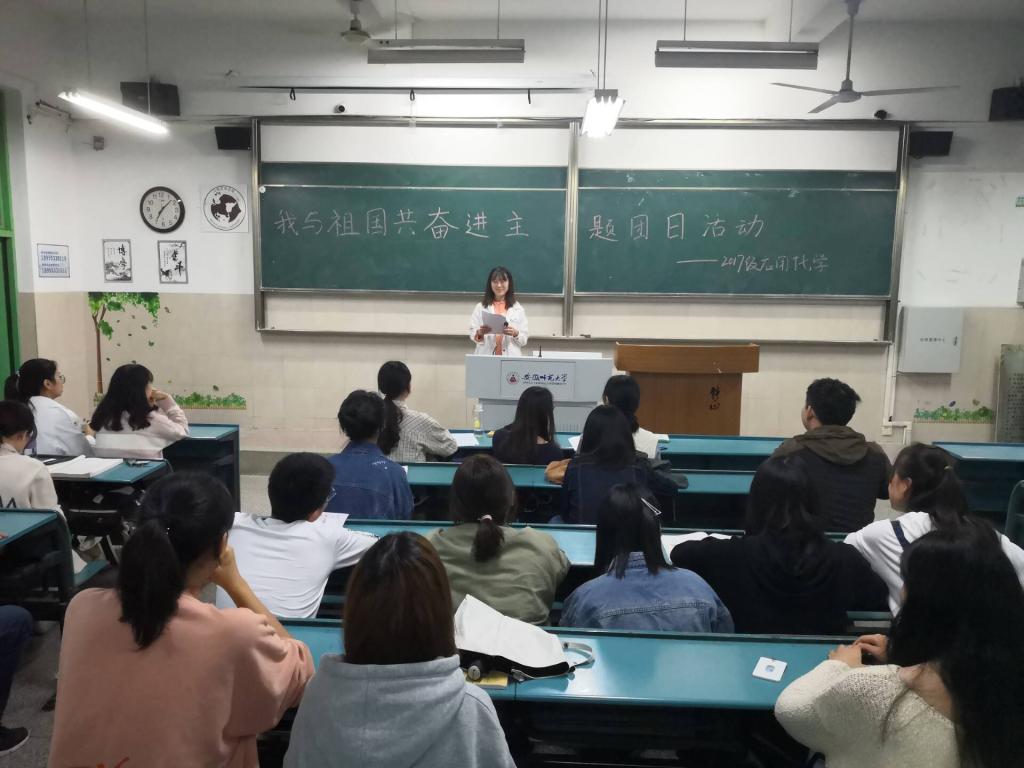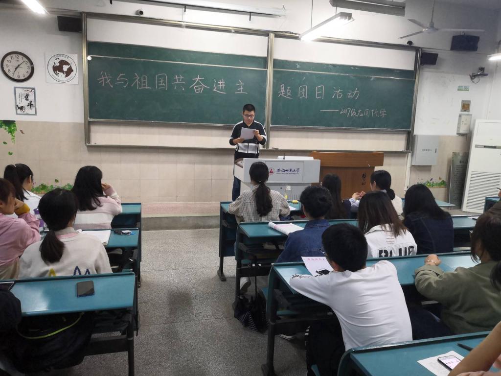 (图文:马磊)10月13日,2017级应用化学专业全体班委在行知楼2040103教室开展我与祖国共奋进主题团日演讲活动。
