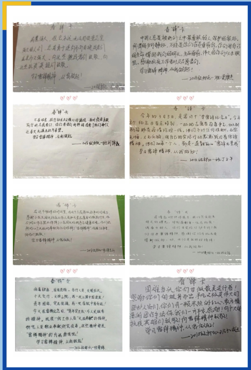 第二部分:春“锋”卡制作。为致敬抗疫人员,致敬各行各业的“活雷锋”,16位同学拿起手中的笔,在各自家中写下16份本支部发起的春“锋”卡征集活动。经团支委成员整理、编辑、制作后,在官Q上推广宣传。即便无法在前线奋战,也可在后方守护英雄们!