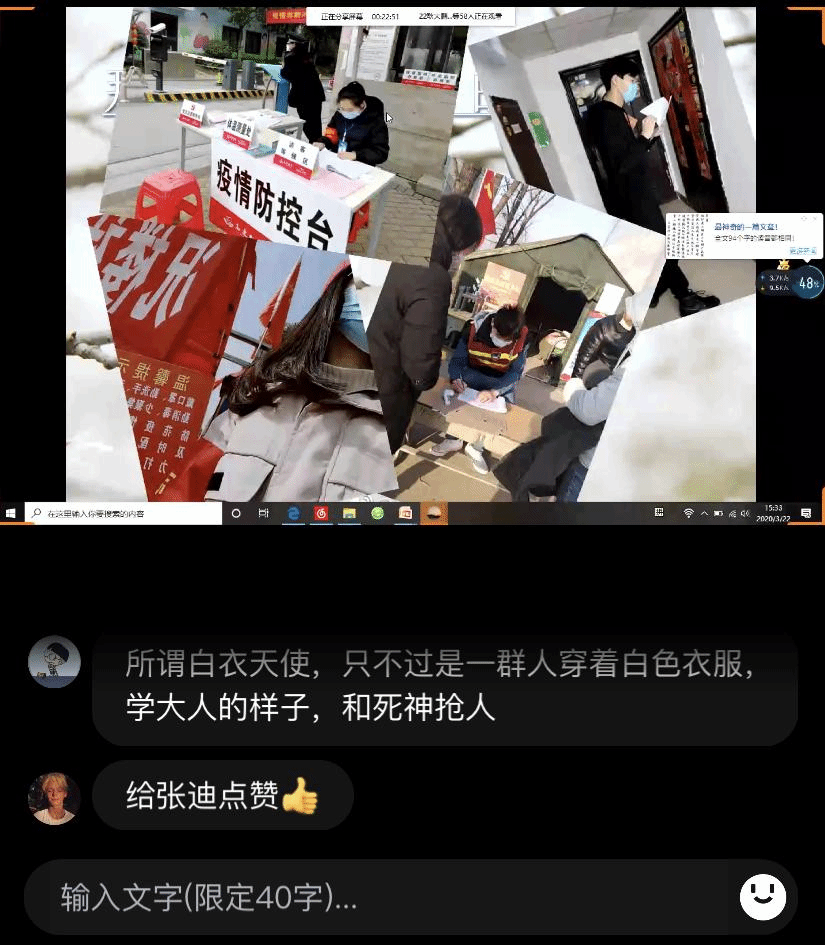 下午15时,全体同学进入直播间,团支书汪可同学带领大家观看了“中国速度——建成火神山医院”视频。同学们表示“无私奉献的火神山建设者、奋战一线的火神山医护人员、辛苦执勤的武警官兵们的精神值得我们敬佩和学习。”