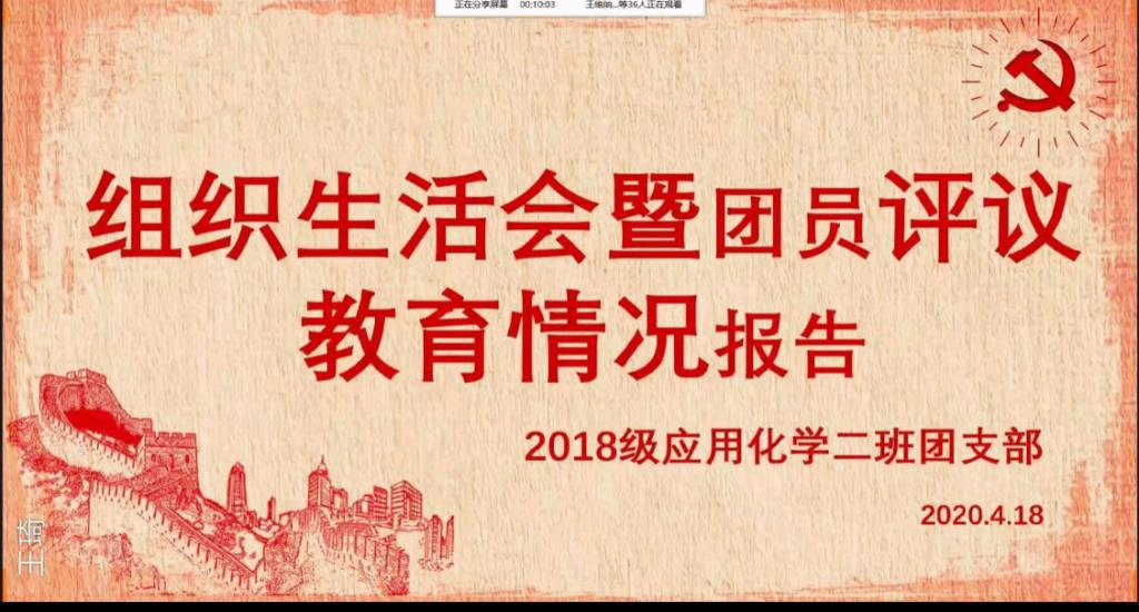 本网讯(18应用化学2班 王皓月)2020年4月18日下午3点,2018级应用化学专业二班同学在团支书王琦的带领下开展了“2019年度团支部组织生活会暨团员民主评议”支部大会,辅导员陶勇老师全程参与支部大会线上指导,本次支部大会旨在对团支部2019年度工作进行及时梳理总结,对支部团员一年的综合表现进行民主评议,激励优秀团员继续完善自我,同时及时改正班级团支部工作存在的不足之处。