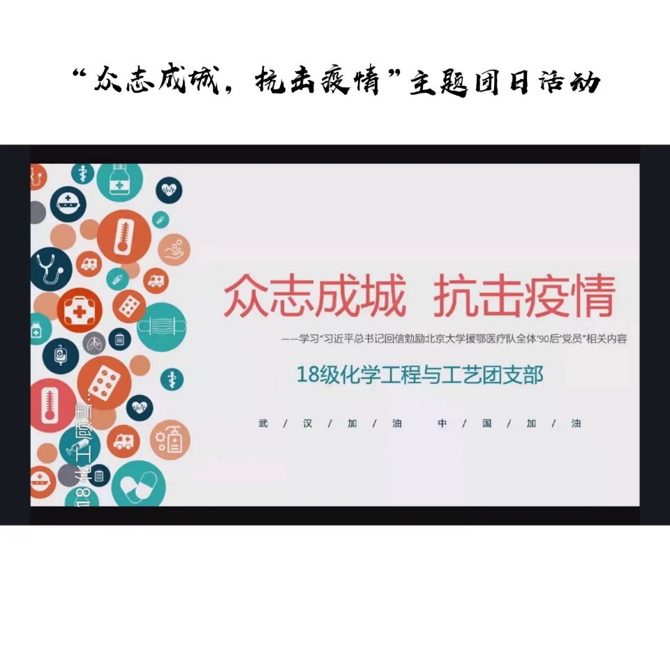 3月22日,2018级化学工程与工艺本科生团支部举行了“众志成城,抗击疫情”主题团日活动。这次团日活动是化工班级首次开展的“云团日”。虽说没有面对面的接触,只能靠网络、靠声音、靠图片传达,但不变的是在一起抗击疫情的心意。此次团日活动,我们在一起学习了习近平总书记回信相关内容,我们交流了疫情期间的感悟与对未来的期望,我们的同学——汪少振、宣守国,选择在抗疫一线为家乡做贡献,他们代表我们2018级化学工程与工艺在行动。