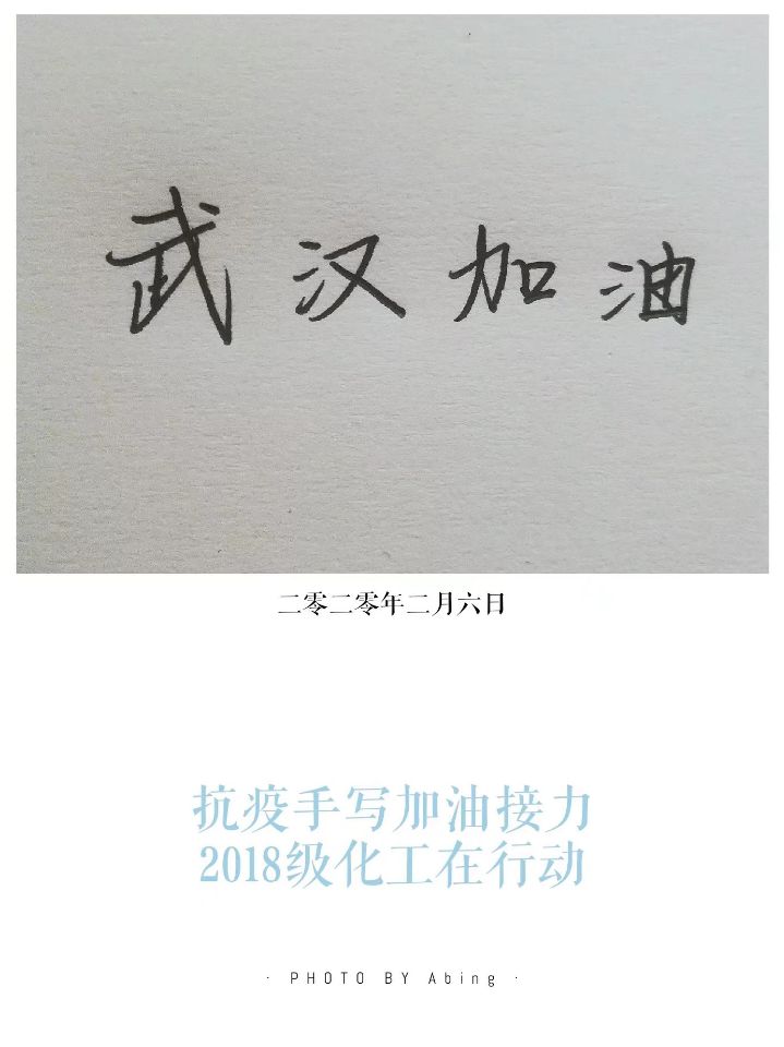 2月6日,化工班级在线上开展了“抗疫手写加油接力,18级化工在行动”的班级活动,同学们用笔写下铿锵有力的文字,接力传递战胜疫情的决心。在疫情初期,这次活动极大地鼓舞了班级同学。虽不能亲临抗疫战场,我们也坚持在大战中坚定决心,我们相信我们强大的国家和勇敢的人民,一定可以解除这次危机。