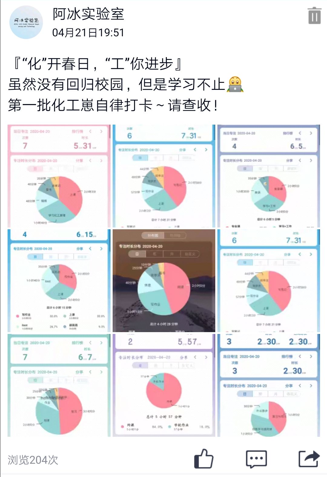 云学习——“化”开春日,“工”你进步,利用软件开启学习打卡,将学习严格到分秒之间。将生活分割成碎片时间记录,确保每天有放下手机专心学习的时间。同时进行学习时间比赛,每日群打卡,学习时间前三名的同学可以获得礼品。