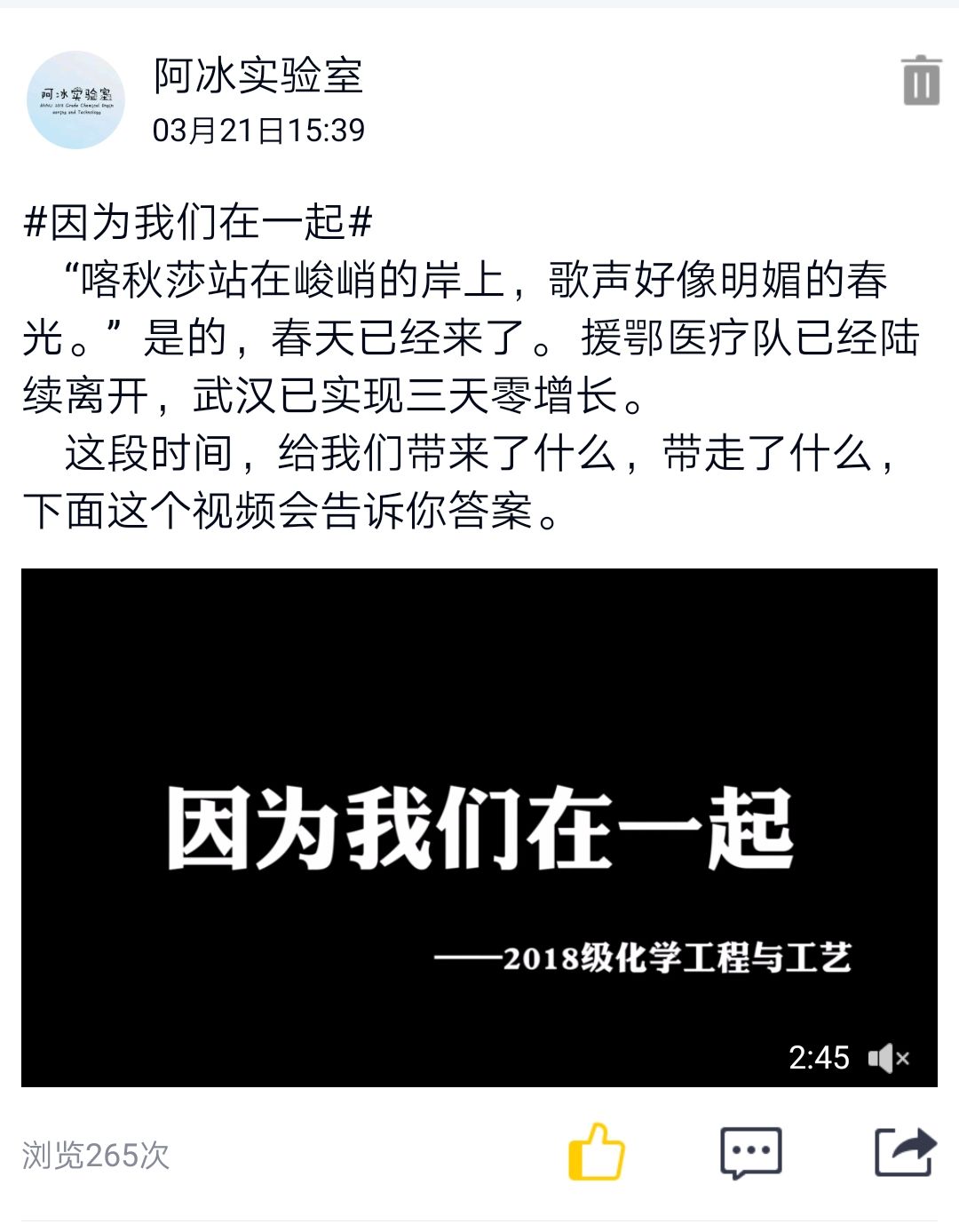 3月21日,疫情得到有效控制,各地区新增病例实现零增长,武汉患病人数不断减少,中国成为最安全的国家。宣传委员收集了疫情给大家带来的思考与感悟,并制作了一条视频——《因为我们在一起》。如果说“抗疫手写加油接力,18级化工在行动”这个活动传递的是鼓舞,那么《因为我们在一起》更多的是劫后余生的感慨。“普通平凡的生活最可贵”、“以后会更加珍惜和父母在一起的时光”、“医护人员辛苦了”、“樱花开了,想去吃热干面”,这些文字是每个人经历疫情的真实想法,仔细体会便能感觉到文字背后是鲜活的人,是可贵的赤子之心。