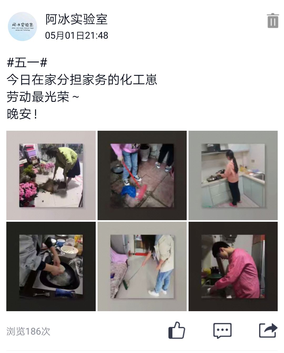 云劳动——五一劳动节期间,班级组织线上劳动活动,组织动员班级同学主动承担家务,在劳动中深化自己对劳动的理解,养成热爱劳动的习惯。