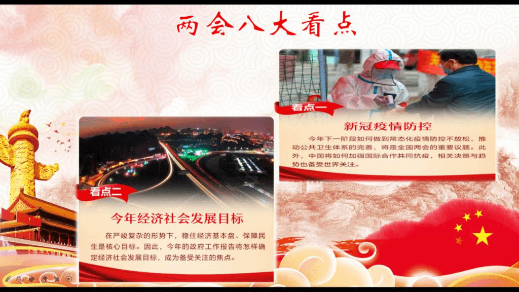 同时,从今年两会的八大看点来了解两会的事宜,并选取其中三个看点:新冠疫情防控、打赢脱贫攻坚战、审议民法典草案,来进行更深入的介绍。以疫情为核心简述中国当前国情以及国际关系处理的问题;同时用一则漫画为我们讲述民法典草案的相关知识,既加强大家的法制观念,又丰富了大家的法律知识,在日常生活中能够做到知法、懂法、守法。