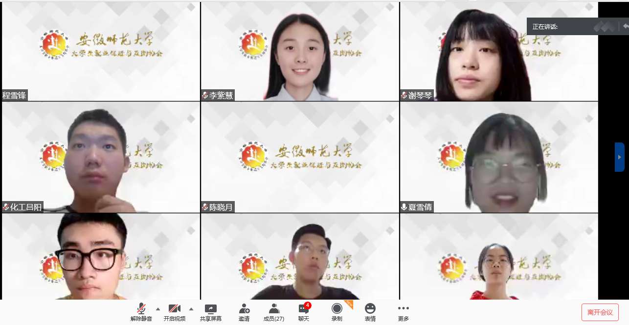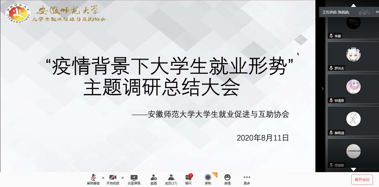 会议伊始,队长陈凯凯首先发言。陈凯凯队长开始就向团队全体队员表达了感谢和称赞之情。他强调,如果没有每一位队员的耐心和辛勤付出,暑期社会实践活动不会顺利进行和圆满结束。其次,陈凯凯队长对于暑期社会实践活动内容进行总结,说道“由于疫情的影响,今年暑期社会实践活动不仅活动形式从线下变为线上,活动的时间也缩减至1〇天,虽然时间不长,但每一天大家都过的很充实。”他指出,此次的活动中,我们与多家企业公司以及个人进行交流调研,从中了解当今老员工的就业形势以及相关专业的招聘标准,同时通过问卷调查,初步了解老员工的就业观,而这些便是我们活动最重要的成果。