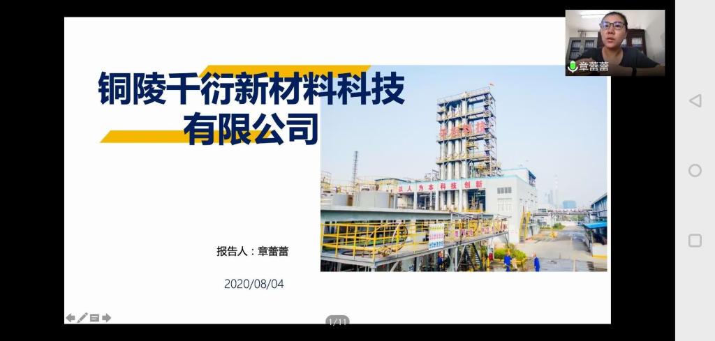 源源不断的弹幕暗含着团队成员们激动的心情,主讲人章蕾蕾老师扎着一束利落的短马尾出现在众人的视线中。首先,章老师介绍了这家2O14年刚刚建立的铜陵千衍新材料科技有限公司的相关概况,铜陵千衍新材料科技有限公司的是一家以化工产品生产与销售为主的民营企业,主打产品是PCMX,具有消菌灭毒的功效,是制造消毒水的重要成分。疫情期间,在确保员工安全产品合格的情况下,为响应国家号召,千衍公司大年初二就开始复工生产PCMX,以此满足消毒水的生产需求。