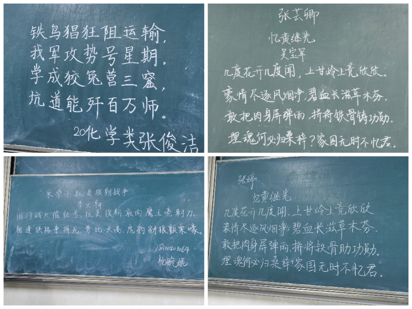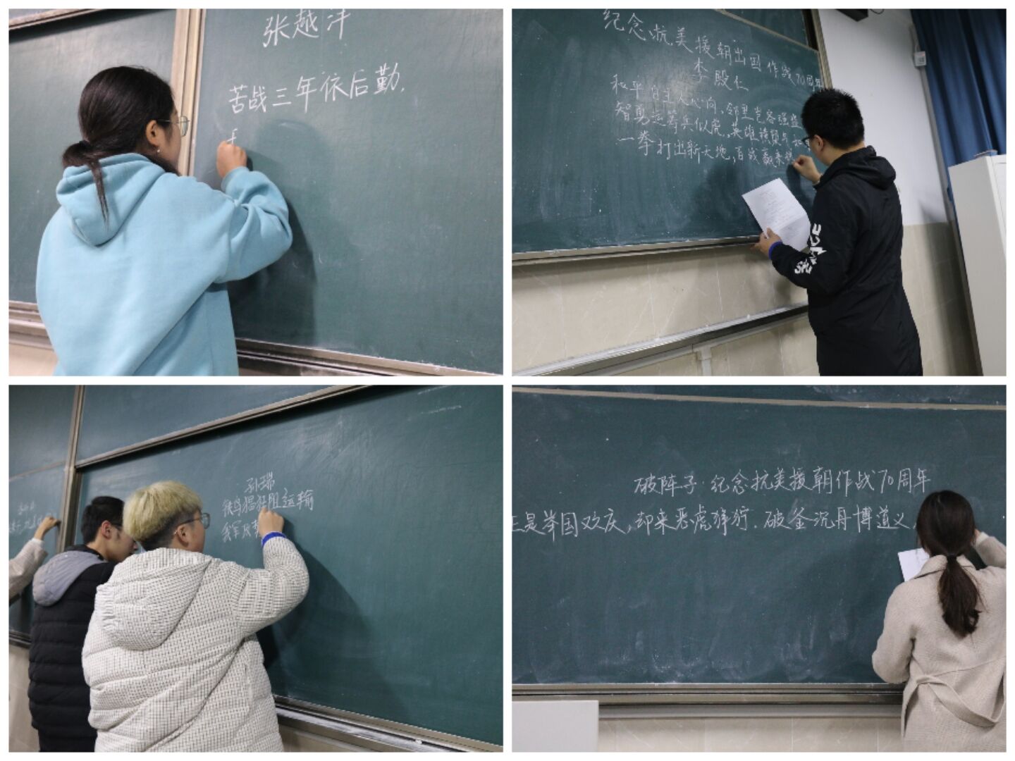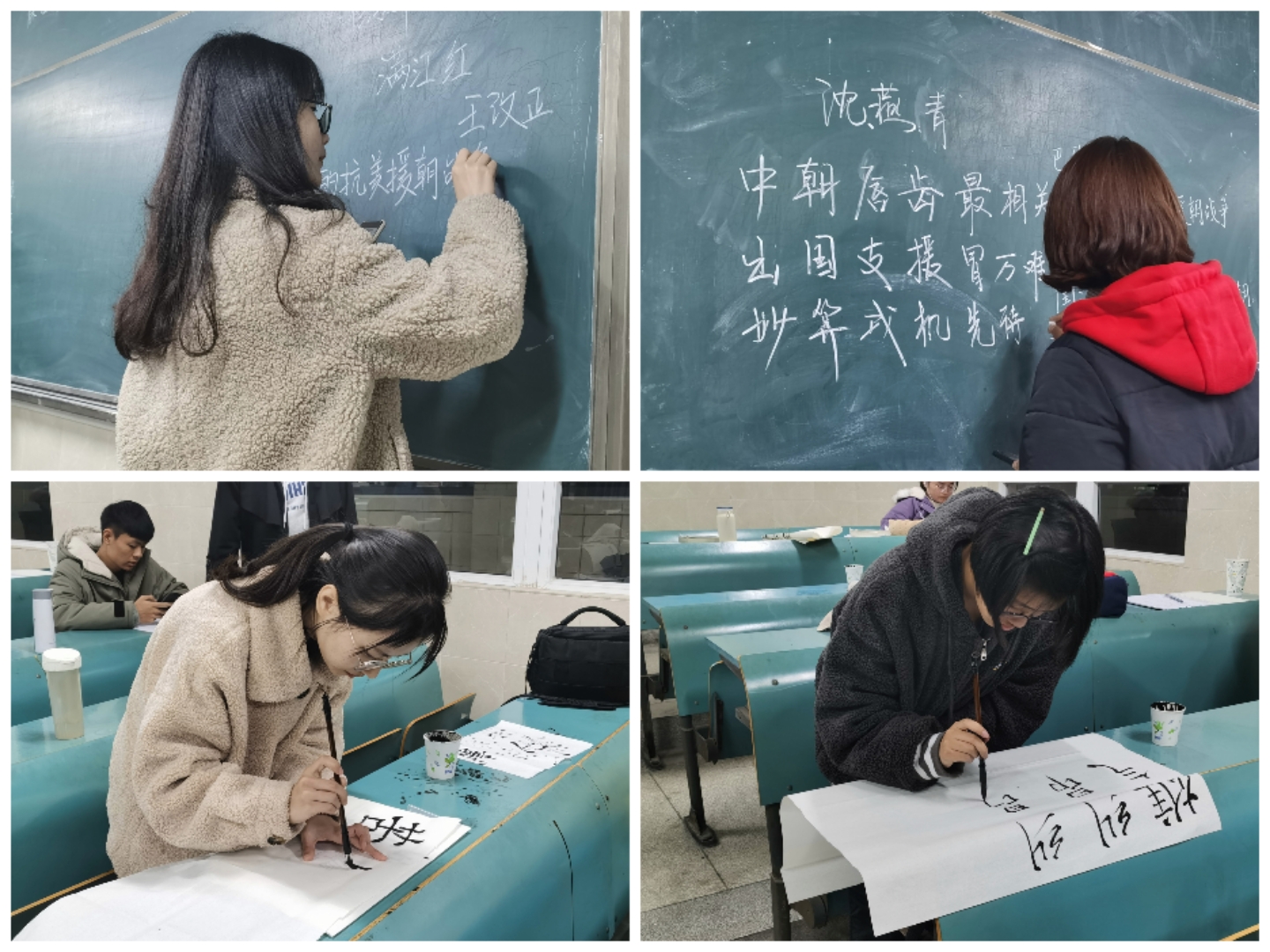 本次比赛参赛对象以在校一、二、三年级本科生为主,鼓励其他年级员工参与,选手同时参加毛笔字、钢笔字、粉笔字三项比赛,各项比赛分区域依次进行。参赛者遵从主持人的安排进行比赛:硬笔字书写流畅结构匀称,笔划间展示学子傲气;粉笔字板书周正规范整齐,横竖间流露师者风范;毛笔字笔走龙蛇潇洒飘逸,撇捺间显现青年担当。选手们借诗句抒发壮志豪情,表达了对抗美援朝精神的致敬。