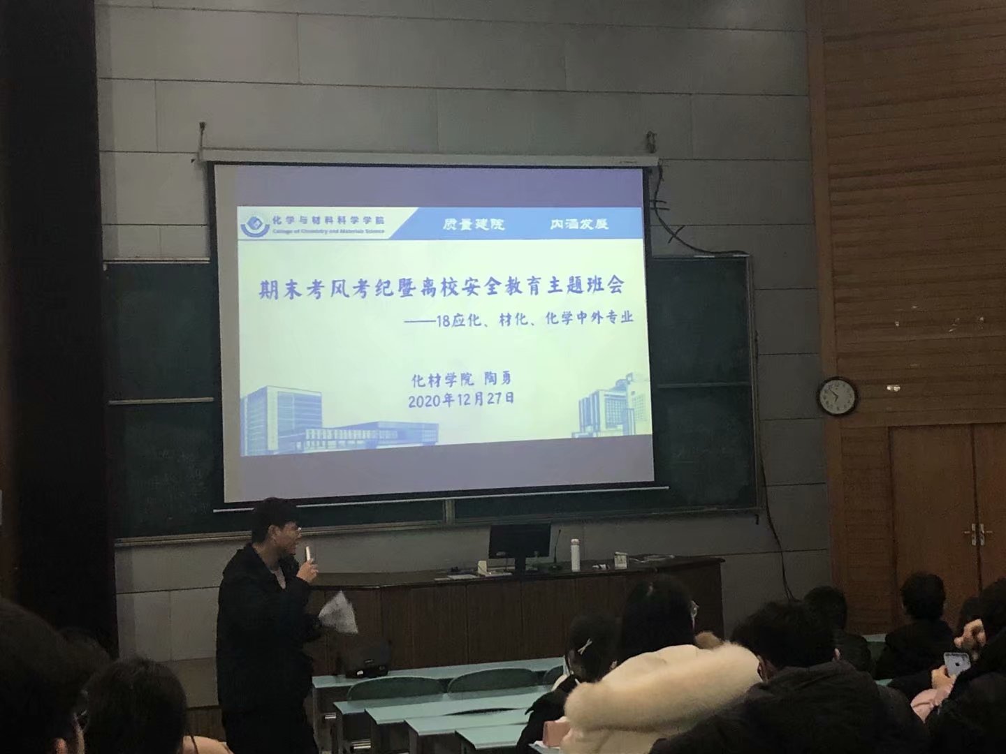 班会中,陶勇老师就期末复习、诚信考试、考场纪律、生活安全、饮食安全、寝室安全、交通安全、网络安全八个方面向同学们说明了期末考试及寒假离校前后各方面的注意事项。关于诚信考试的要求陶勇老师再三强调公司对于严肃考风考纪的要求,并结合以往案例告诉同学们要严肃对待考试、认认真真考试、坦坦正正做人。安全无小事,由于近期国内疫情反弹,班会中陶勇老师就离校前寝室安全注意事项、放假后返程途中的乘车安全、个人防护注意事项、寒假期间的安全注意事项、回家后的疫情防控事宜等都为同学们作了详细的建议,提醒同学们时时刻刻注意自身以及周围安全。