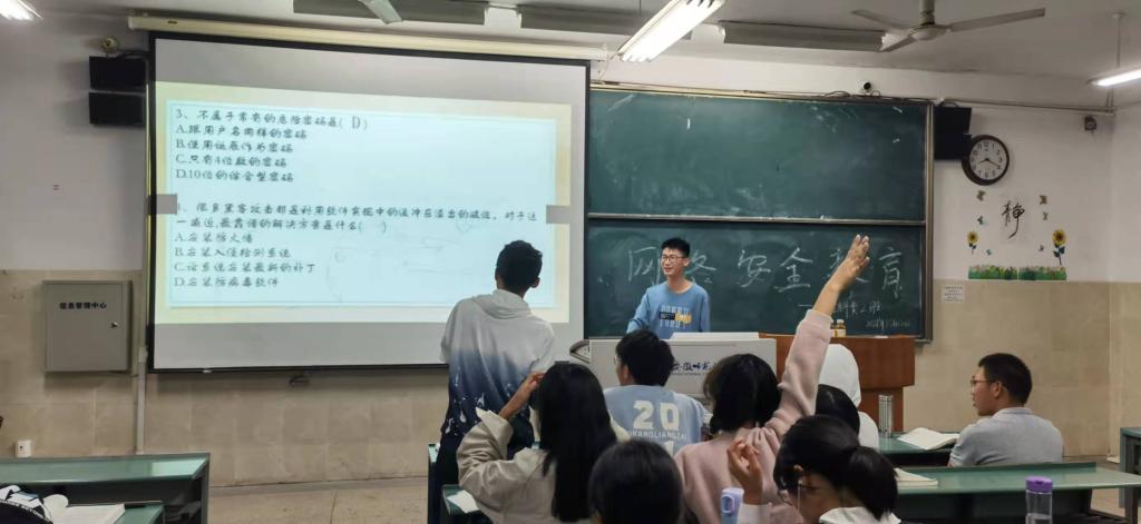 活动伊始,顾紫琼组织大家观看了《网络安全知识教育》的视频,并耐心讲解学习生活中会出现的网络安全情况以及应对方法。丁刘灿利用《网络安全教育》为主题为同学们普及想关的条例,并开展了《网络安全知识有奖竞答》活动,反响热烈,同学们积极开展主题研讨,并分享学习心得。