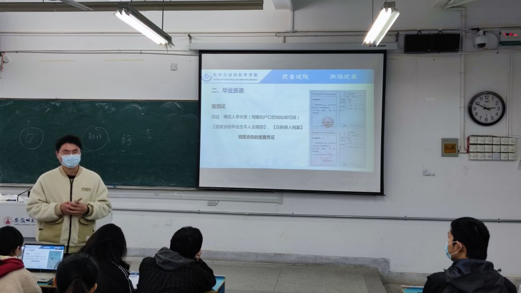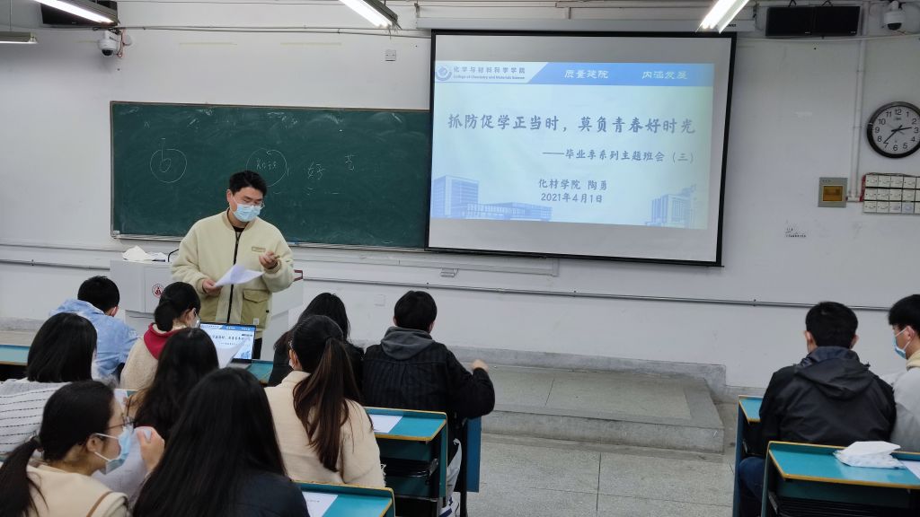 本网讯(18应化一班陆陈鑫)2022年4月1日下午在2070101教室,2018级应用化学、材料化学、化学中美班的全体同学在辅导员陶勇老师的带领下召开了“抓防促学正当时,莫负青春好时光”毕业季主题班会(三)。会上,陶老师就毕业生登记表填写、求职网签以及毕业派遣材料、近期校园安全管理相关事宜作了详细介绍,让同学们对即将到来的毕业事宜了熟于心。