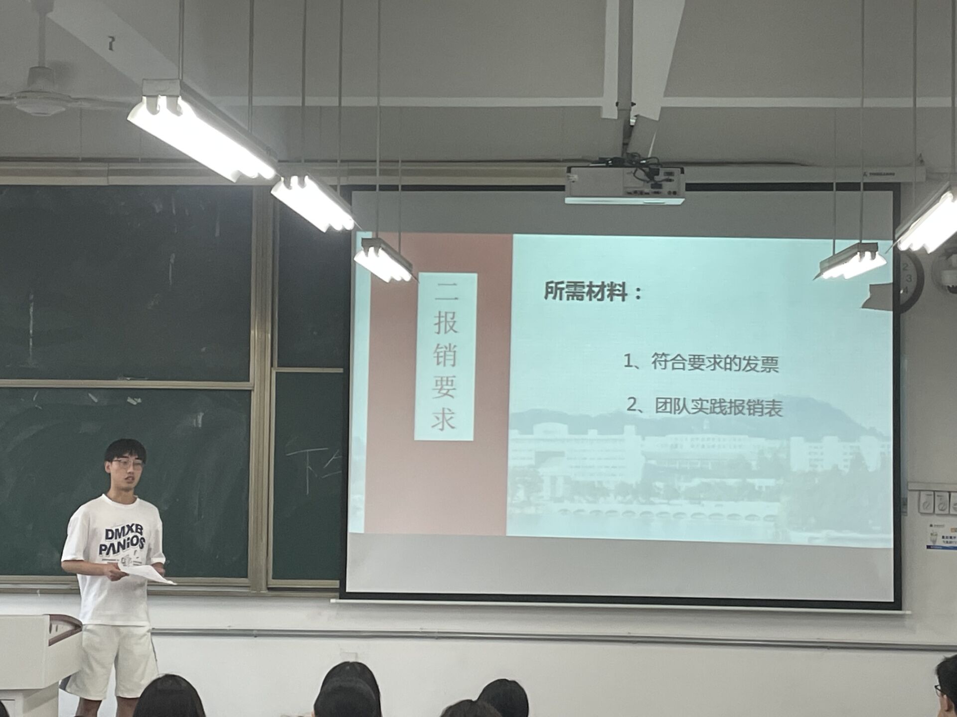 在举行安全培训会后,英国正版365官方网站开展了暑期社会实践财务培训会,院团委办公室部长左博文对财务报销制度进行详细的解说,他分别从报销原则、报销流程、报销要求和注意事项进行了解读,并展示了可报销票据。各实践团队代表认真听讲,积极互动,询问相关问题并及时解答