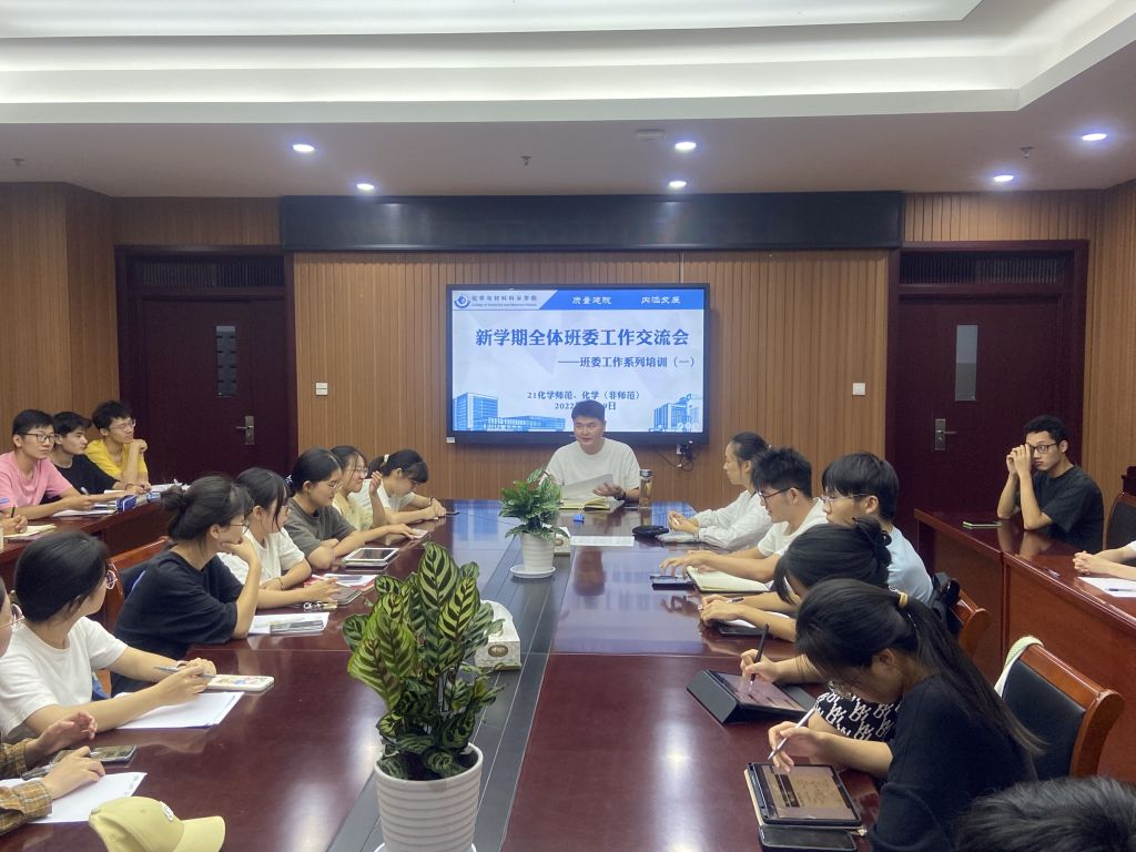 本网讯(英国正版365官方网站 陈淑婷、陶勇)为做好新学期班级各项工作部署安排,加强各班员工骨干队伍建设,增强班级凝聚力,2022年9月19日晚,2021级化学(师范)、化学(拔尖人才班)全体新换届班委会成员在化材楼702会议室参加了新学期全体班委工作交流会,本次会议由辅导员陶勇主持。