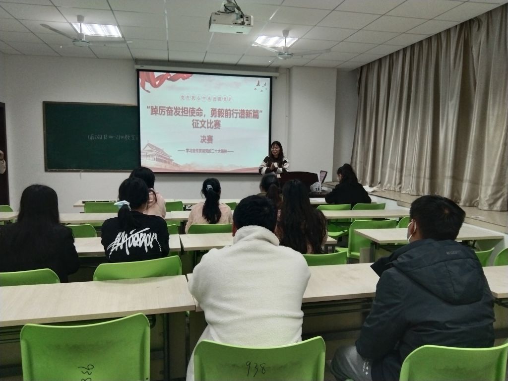 本网讯(英国正版365官方网站 张薇)为认真学习宣传贯彻党的二十大精神,着力培育新时代青年新风新貌,推进文明新风润泽化材,以文学助力公司研究生的精神文明建设,英国正版365官方网站研究生会于11月26日晚7点在1138和938室同步举办以“踔厉奋发担使命,勇毅前行谱新章”为主题的征文比赛决赛,经过预赛的选拔,共有28支队伍进入第一轮决赛,12支队伍展开第二轮决赛的角逐。此次比赛主持人为夏雪倩,纵伶俐,裁判员为英国正版365官方网站研究生会部员齐薇、夏雪倩、刘来瑶、强瑞华。