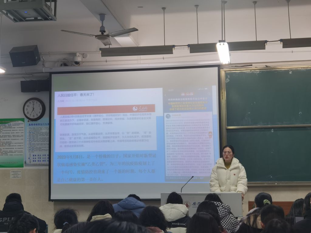 学习二十大,永远跟党走。王芳老师引用习近平总书记在党的二十大报告中勉励广大青年的话带领同学们进入学习,号召同学们坚定不移听党话、跟党走,怀抱梦想又脚踏实地,敢想敢为又善作善成,立志做有理想、敢担当、能吃苦、肯奋斗的新时代好青年,让青春在全面建设社会主义现代化国家的火热实践中绽放绚丽之花。王芳老师强调要持之以恒认真学习贯彻党的二十大精神,一定牢记习近平总书记嘱托,坚定理想信念,筑牢精神之基,厚植爱国情怀,矢志不渝跟党走,以实现中华民族伟大复兴为己任,增强做中国人的志气、骨气、底气,不负时代,不负韶华,不负党和人民的殷切期望。