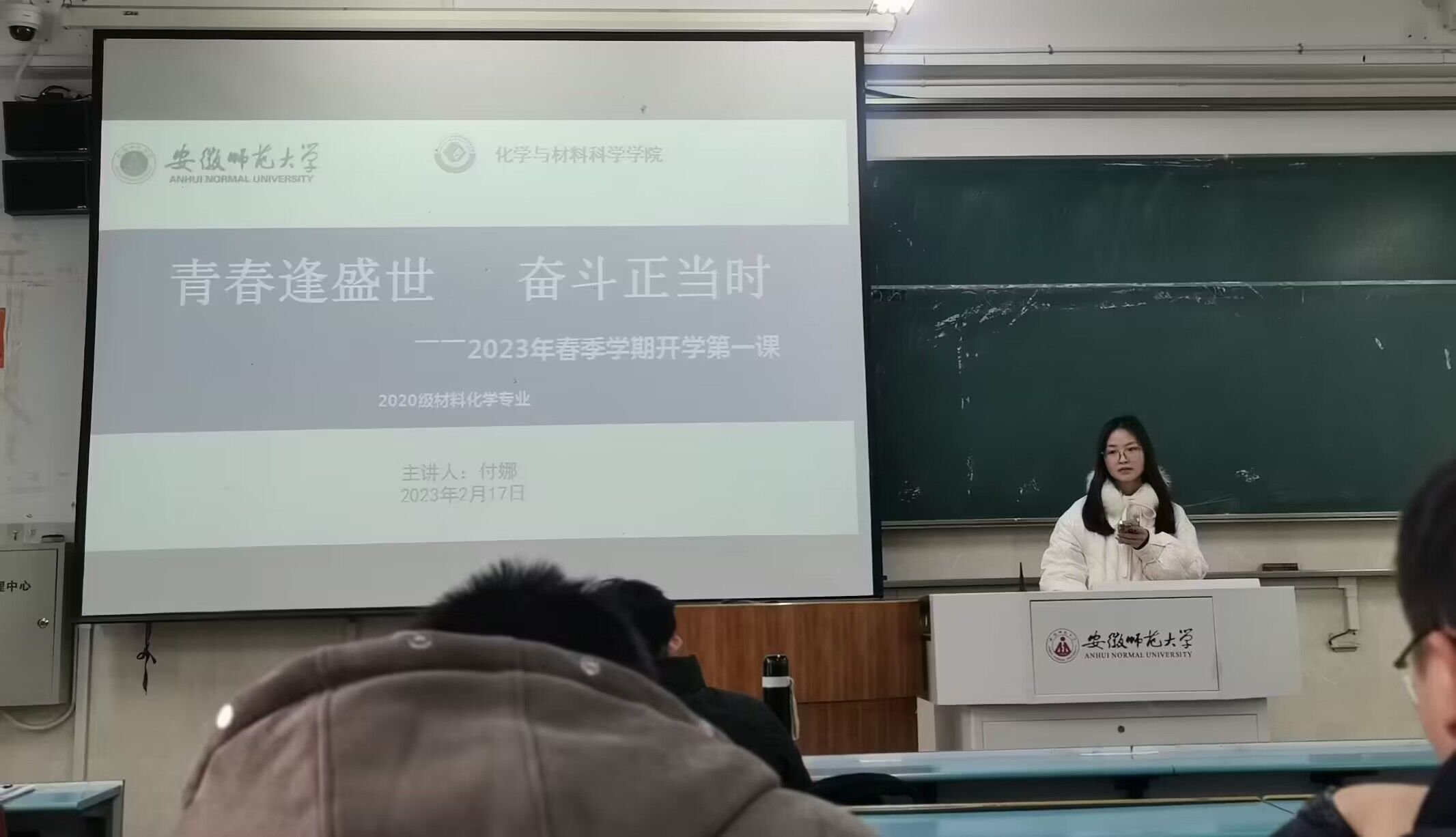 本网讯(英国正版365官方网站曹冉、付娜)日月开新元,万象启新篇。为了进一步学习贯彻党的二十大精神,真正将党的精神内化于心外化于行,同时做好新学期相关员工工作的指导与服务,2020级材料化学专业于2023年2月17日在行知楼2010308教室开展了“青春践行二十大”2023年“开学第一课”主题班会。本次班会的主讲人为辅导员付娜。