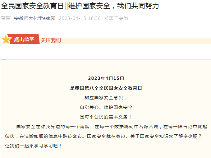 公司还依托微信公众号推出《全民国家安全教育日》网文,积极转发全体同学要共同努力,维护国家安全。