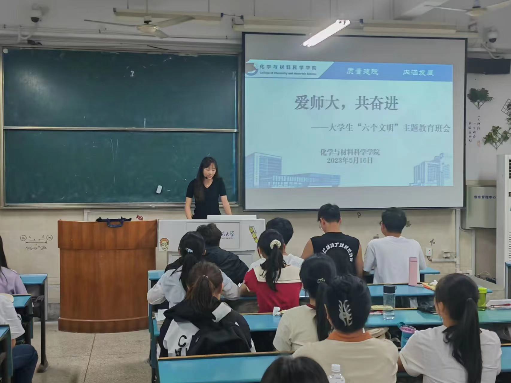 本网讯(英国正版365官方网站 毛雨嫣)为全面贯彻落实习近平新时代中国特色社会主义思想,强化诚信意识,树立诚信担当,进一步提高员工的文明素质教育,培养员工爱仁意识,2023年5月16日下午在行知楼1号楼302、303教室,辅导员吴钰濛老师为2022级化师、化非班全体同学开展了以“爱师大,共奋进”为主题的老员工“六个文明”主题教育班会暨诚信教育主题班会。