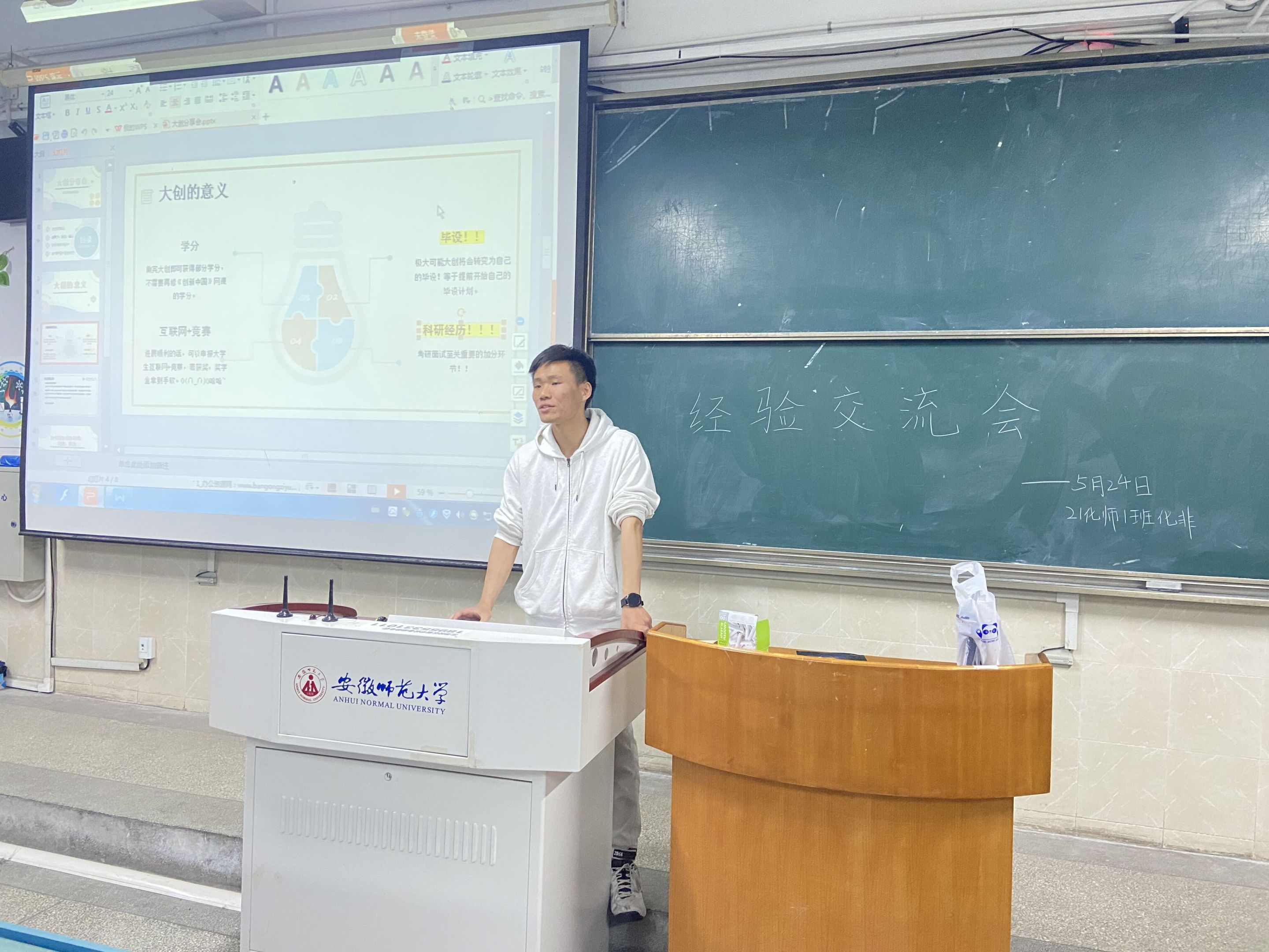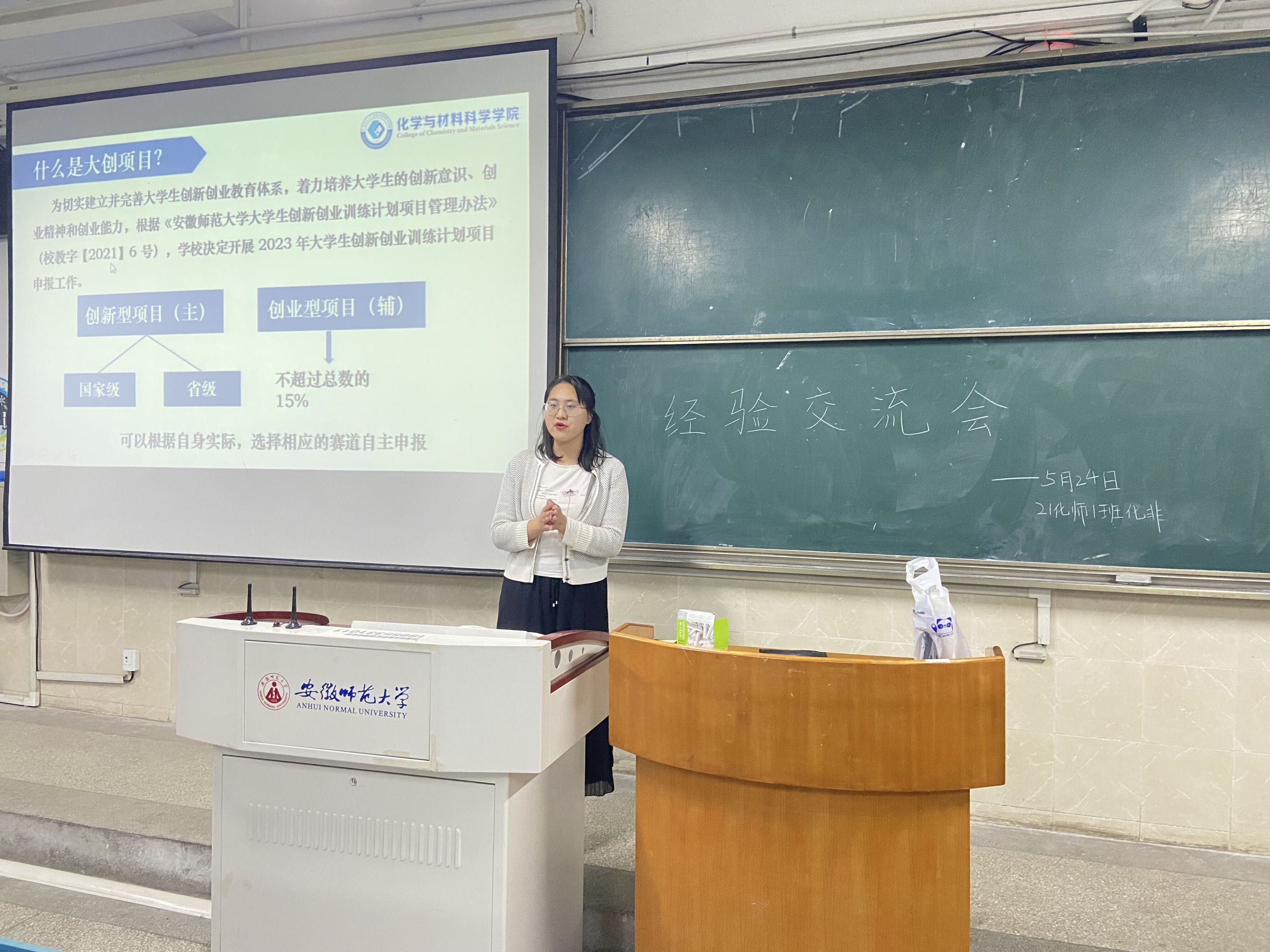 本网讯(英国正版365官方网站 盛莹)为调动英国正版365官方网站员工对大创的积极性,帮助同学们深入了解大创申报,学习大创开展相关事宜,5月24日晚,2021级化师1班和化非班在2010504教室开展大创经验交流分享会,本次会议邀请了2019级化学非师范王睿和应用化学专业吴泓婧作为分享人。