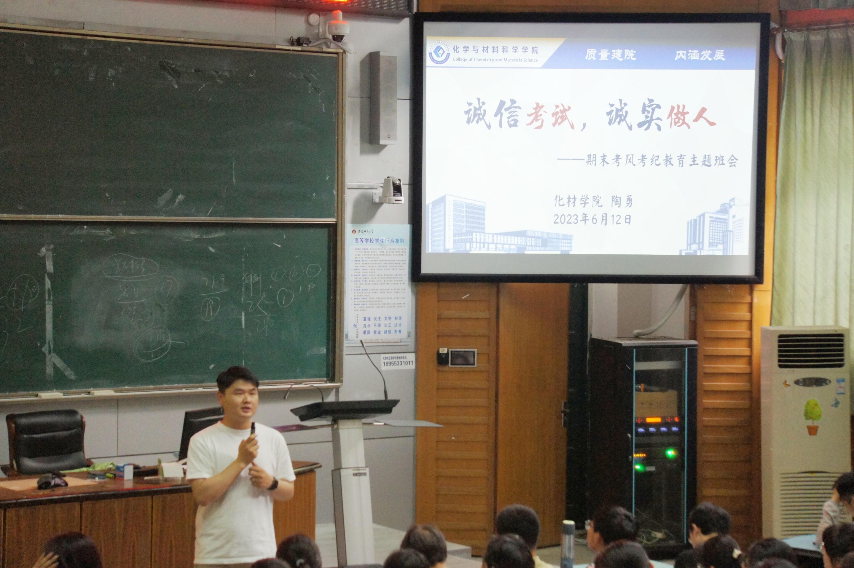 随后,为进一步加强期末班级学风建设和考风考纪教育,引导员工自觉遵守考试纪律,抵制作弊等不良风气,营造文明诚信的考试氛围,陶老师面向全体同学开展了期末考风考纪专题教育。他从考试的重要性、作弊的心理动机、考试作弊的愿意和后果等方面进行了重点强调,提醒所有同学要把好考试质量关,营造公平、公正的考试环境,引导员工明确考试的根本目的,做有德性、守契约、讲诚信的化材人。