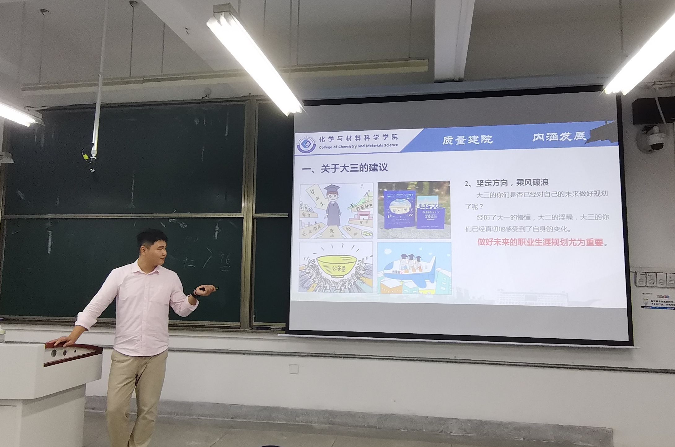 新学期,新征程,新收获,为帮助同学们尽快适应返校后的校园学习和生活,以饱满的精神状态和昂扬的奋进姿态开启新学期,8月28日晚,21化学师范、化学(非师范)专业全体同学在行知楼2070201教室参加了“心怀期许,迎接新光”——开学第一课主题班会,会议由辅导员陶勇主持。
