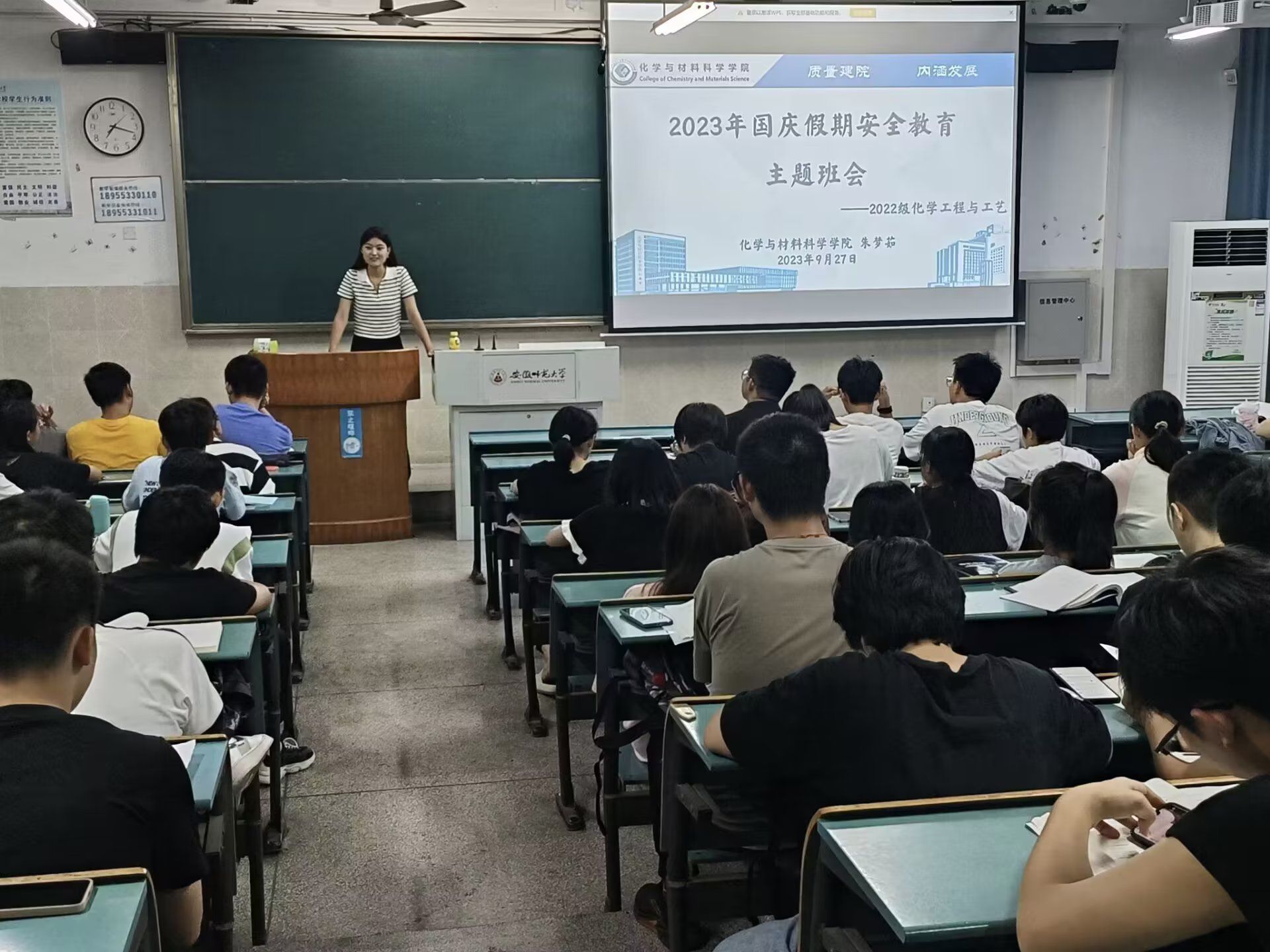 本网讯(英国正版365官方网站 朱梦茹)为做好中秋、国庆假期员工离校的安全教育,增强员工的安全防范意识,欢度中秋国庆佳节,9月27日晚上在2010505教室开展2022级化学与工程专业召开了国庆假期安全教育主题班会,2022级化学工程与工艺专业全体员工参加。