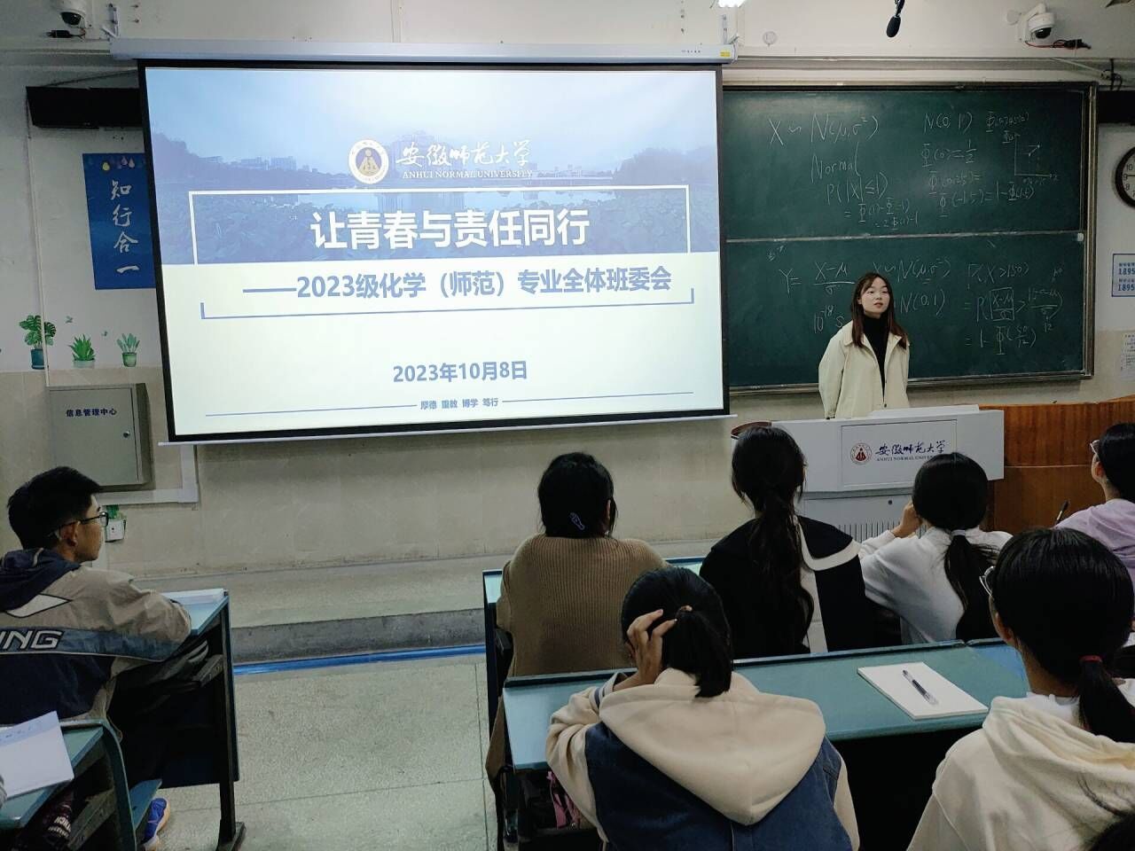 本网讯(英国正版365官方网站 郭雨涵 王霞)秋风送爽,金桂飘香。为更好的开展班级建设工作,23级化学(师范)专业于10月8日18:00在行知楼1号楼205室开展了23级化师专业班委第一次例会。辅导员王霞老师出席并主持本次会议,本专业全体班委参加会议。