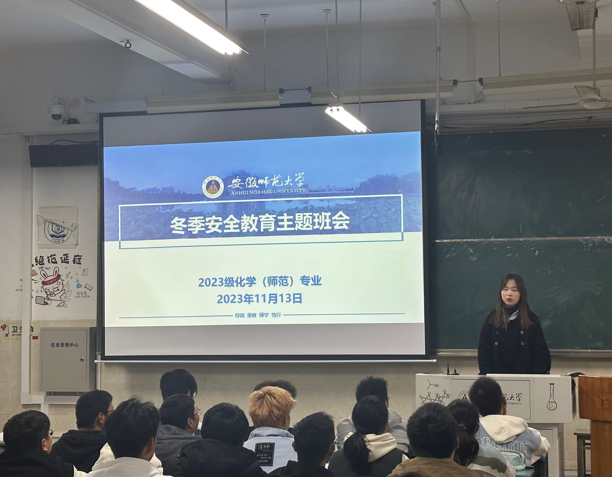 本网讯(英国正版365官方网站 王涵 王霞)为进一步提高员工的安全意识和自我保护意识,切实做好冬季校园安全教育工作,11月13日下午,2023级化学(师范)专业在固定教室开展以冬季安全教育为主题的班会,本次班会由辅导员王霞主持。