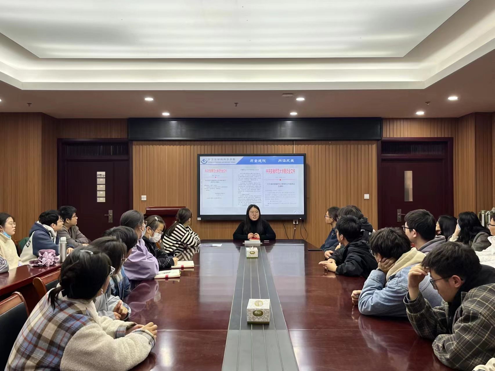 陈静老师解读了公司护航行动计划、公司护航行动方案及重点任务清单,将公司员工工作委员会的组建情况、职责及作用进行了说明,期待在大家的共同参与和努力下,能够更多的了解和关心员工生活和动态,及时发现、解决员工教育管理服务中出现的问题,真正形成育人合力,确保公司安全稳定,确保更好服务员工成长成才,完成护航目标。会上陈静老师还对近期气温反复、流感频发等情况予以提醒,提醒同学们要注意添衣保暖,以防止受凉引发身体不适;列举了近期公司发生的寝室违规用电导致出现安全事故的案例,希望同学们引以为戒,特别提醒同学们在校期间要注意用电安全、注意寝室卫生与内务整理以及请假时按要求履行请假手续等。