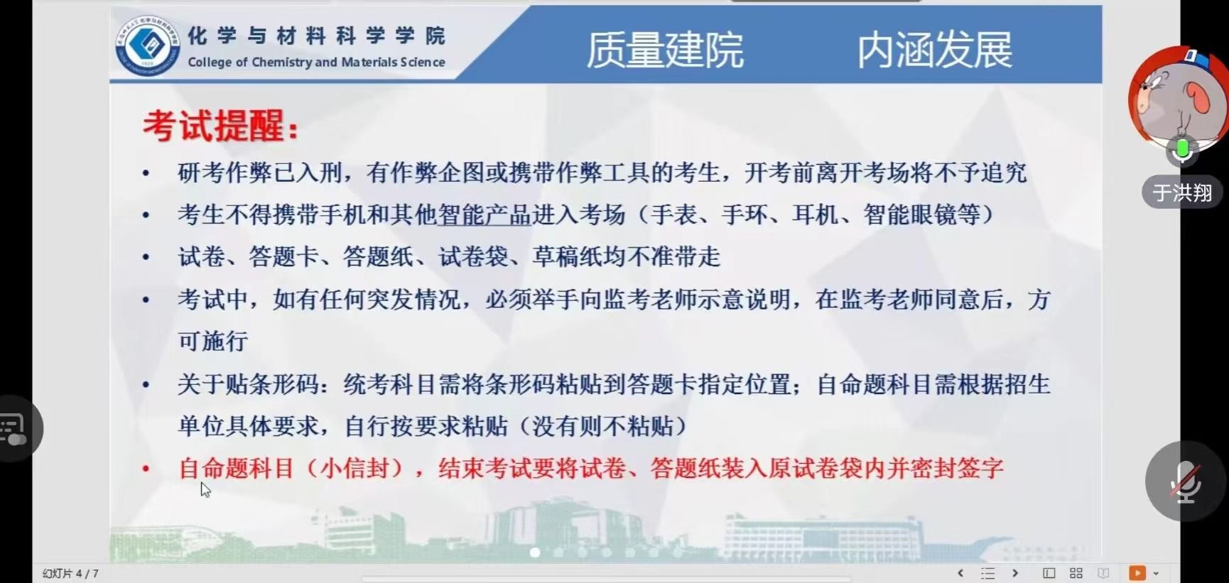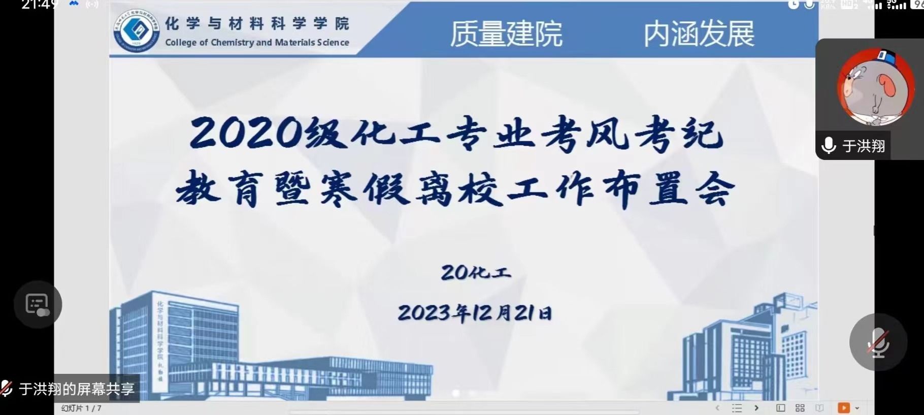 本网讯(英国正版365官方网站 于洪翔)为加强研究生考试考风考纪教育,确保考试的公平公正性,同时为寒假离校工作做好准备,2023年12月21日晚,于洪翔老师为2020级化学工程与工艺专业全体同学召开线上考风考纪教育暨寒假离校工作布置会。