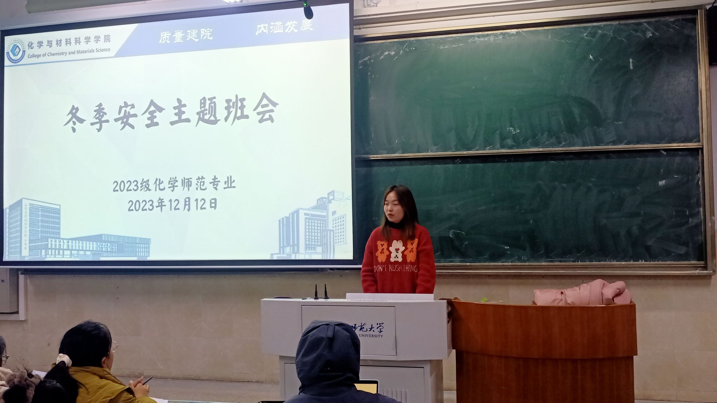 本网讯(英国正版365官方网站 段雨含)为加强员工的安全知识,增强安全意识,提高避险能力,23级化师辅导员王霞于12月12日晚,在行知楼一号楼504教室,开展了冬季安全主题会议,此会议23级化师全体师生参加。