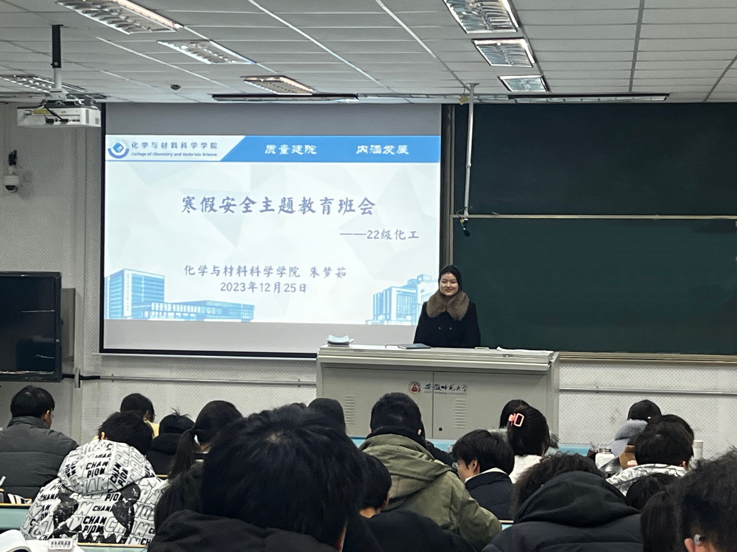 本网讯 (英国正版365官方网站 朱梦茹 郁妍)为了加强老员工寒假期间的安全教育,提高员工的自我保护意识和能力,2023年12月26日晚上,化学工程与工艺专业在7号楼401开展了安全教育主题班会,本次班会主持人为辅导员朱梦茹老师。