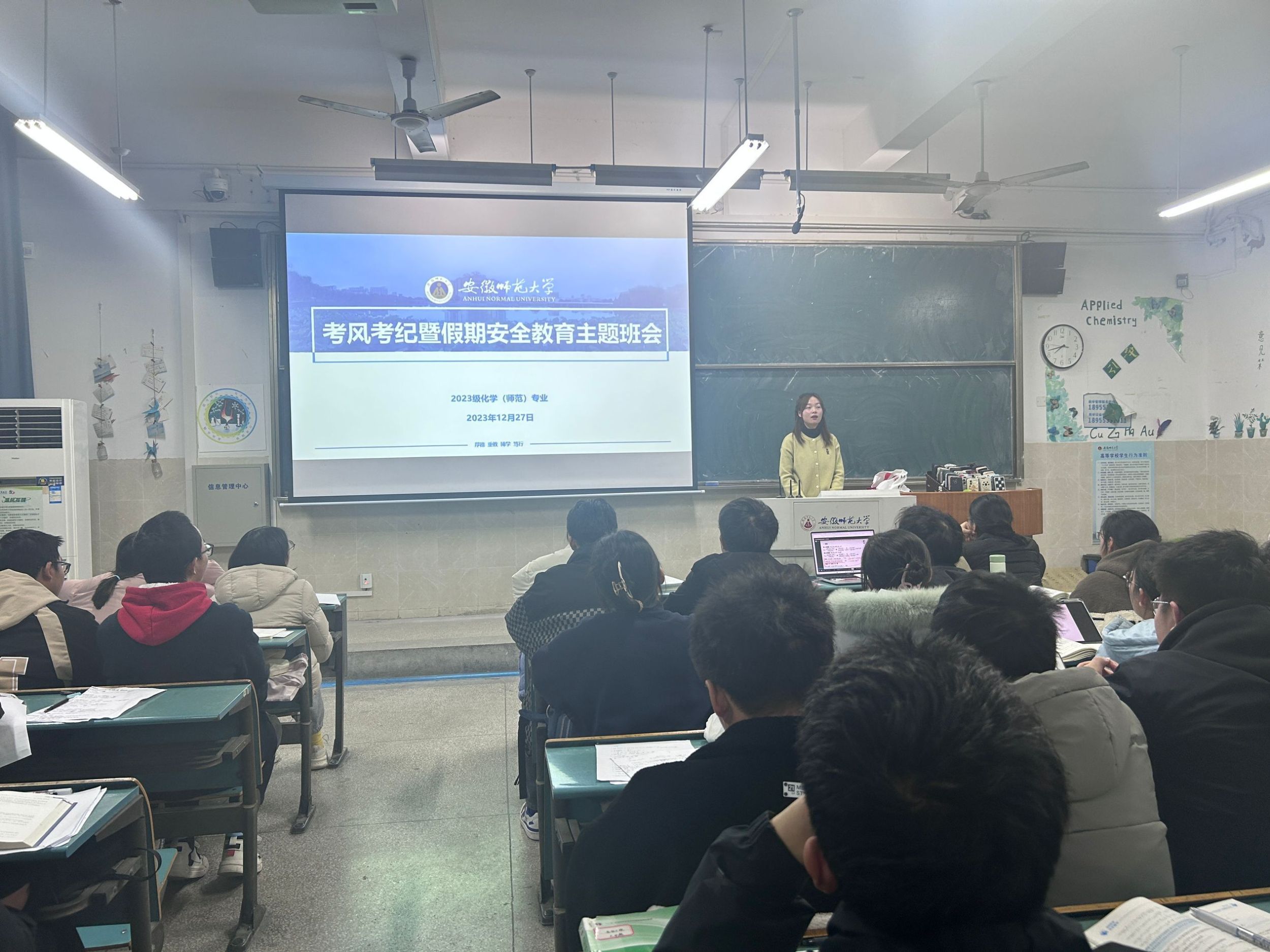 为了端正考风,严肃考纪,加强学风建设,营造文明、诚信考试的良好氛围,同时也为了提高员工的道德修养和思想素质,2023级化学(师范)专业于12月27日在1号楼308、502、504教室开展了考风考纪暨假期安全教育主题班会,专业全体同学参与此次班会。