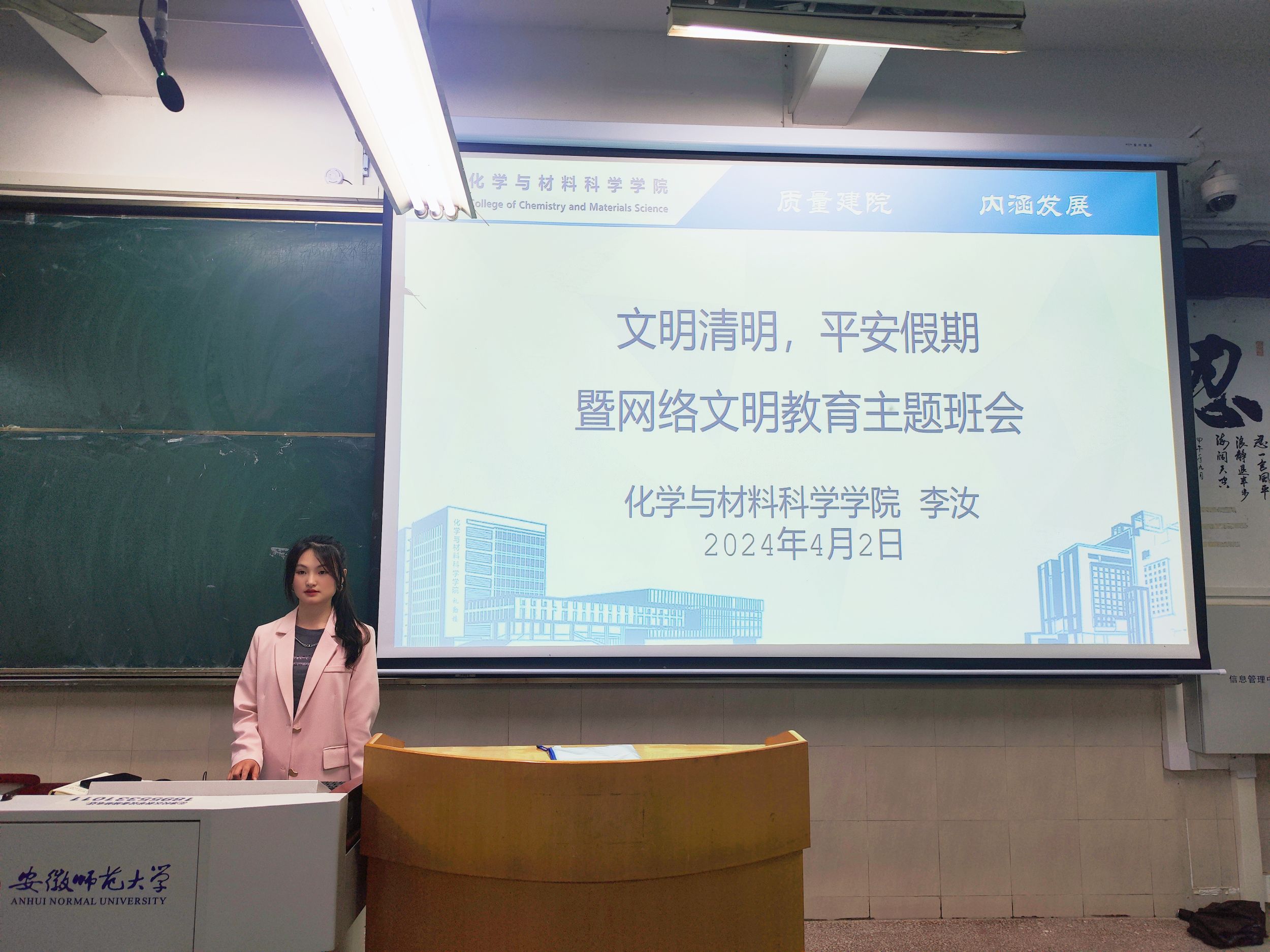 据悉,22材化同学全体参会,认真学习。对清明放假安排更加明白,对放假的安全工作更加深刻。本次班会让同学们对人身安全、财产安全、交通安全、饮食安全等安全问题有所防范,为同学们的安全假期保驾护航。