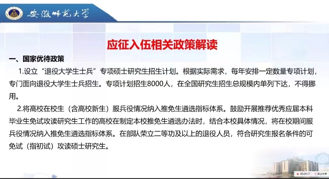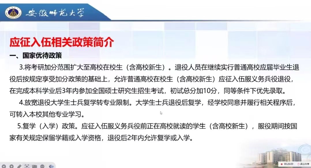随后,为进一步推进公司2024年秋季应征入伍工作,提升广大青年员工的国防意识,陶勇从国家优待政策、芜湖市优待政策、公司优待政策 、入伍后在部队发展途径、退役后发展途径等方面详细解读了征兵政策,引导同学们把参军入伍当做锻炼磨砺自己的大舞台,在主动承担重任、积极投身国防的同时实现个人能力素质的全面提升。