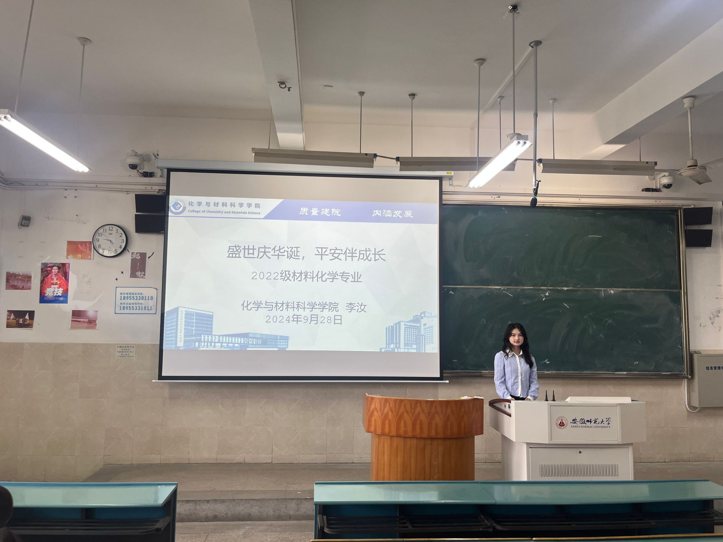 本网讯(英国正版365官方网站 李汝 冷子辰)为增强同学们的安全意识,确保大家度过一个安全、愉快的国庆假期,2022级材料化学专业全体同学于2024年9月28日上午召开了“盛世庆华诞,平安伴成长”主题班会,会议由辅导员李汝主持。