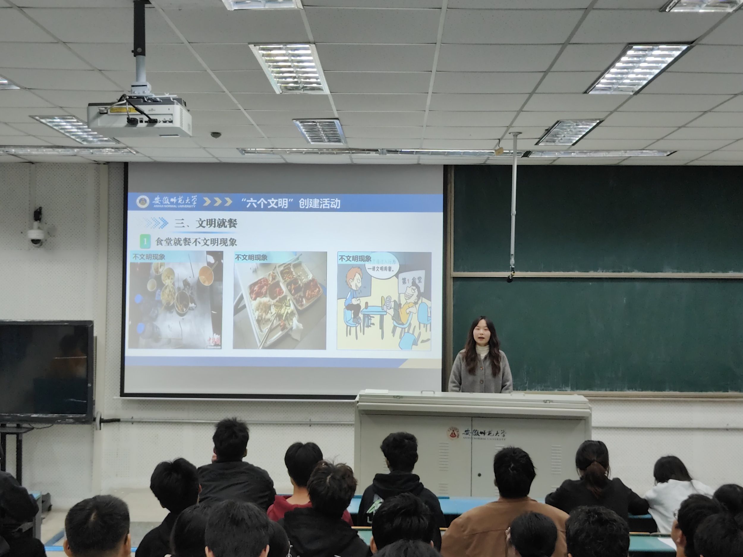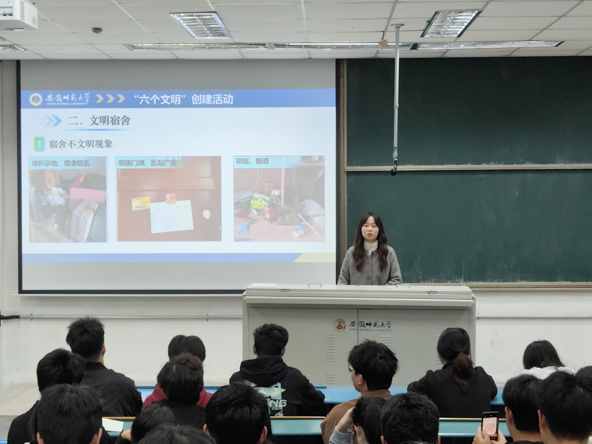 随后,王霞老师指出,为深入推进老员工护航行动计划,贯彻落实习近平总书记指导的重要讲话精神,进一步规范员工文明行为,引导员工形成良好的行为习惯,营造安全有序、文明健康的校园育人氛围,深化老员工“六个文明”教育实践专项活动,分别从六个方面详细的介绍了如何打造文明校园。旨在希望全体同学要以“主人翁〞的意识持之以恒地努力付出,不断增强思想自觉,充分认识到培养文明习惯和修身意识对成长成才的重要意义,从身边做起,从小事做起,以实际行动践行文明宣言,争做文明师大人。