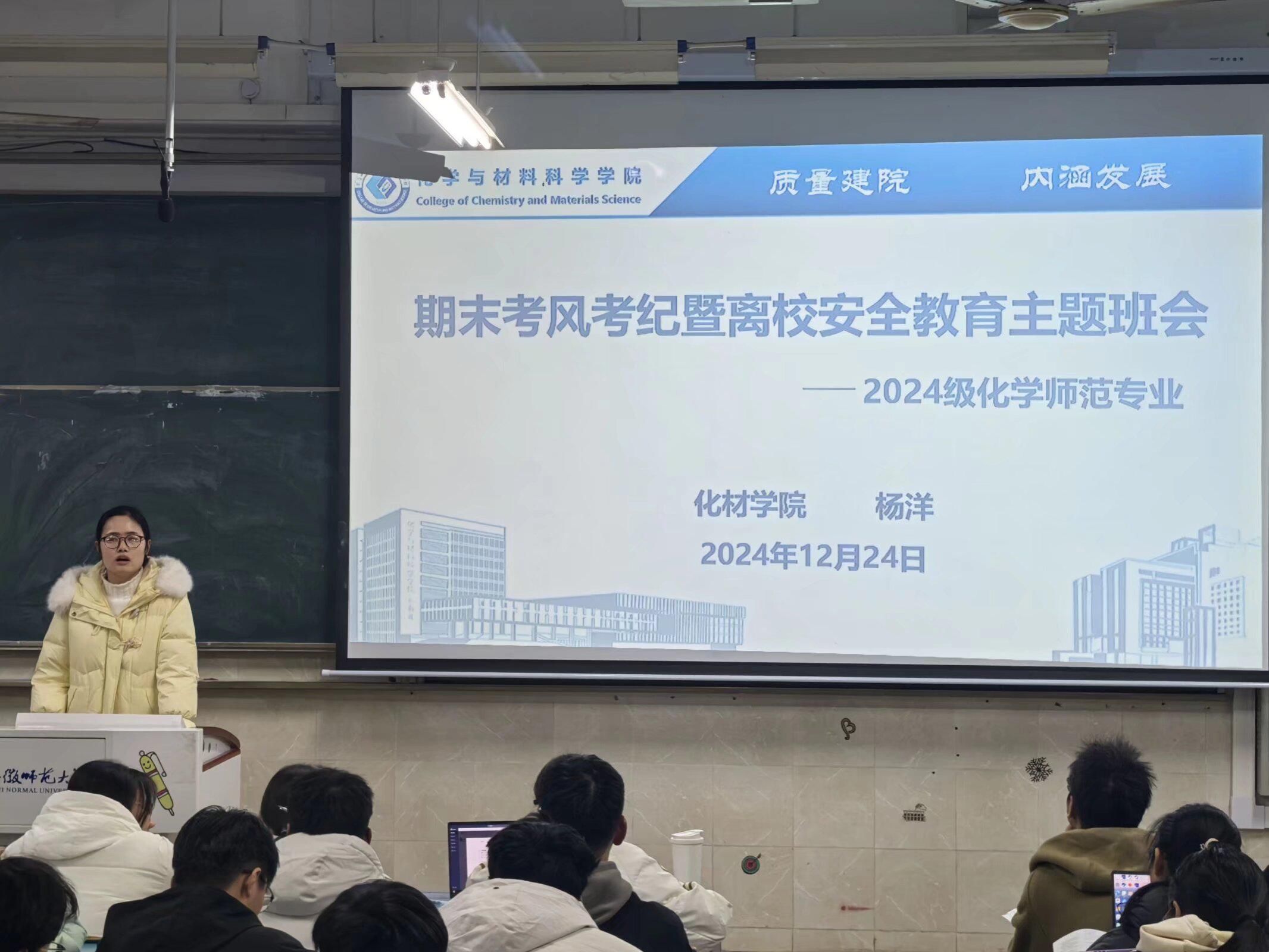 为做好期末考前动员,督促员工积极备考,加强考风考纪教育,确保考试的公平公正性,同时为寒假安全离校工作做好准备,12月24日晚,杨洋老师为2024级化学师范专业员工召开考风考纪暨安全教育主题班会。