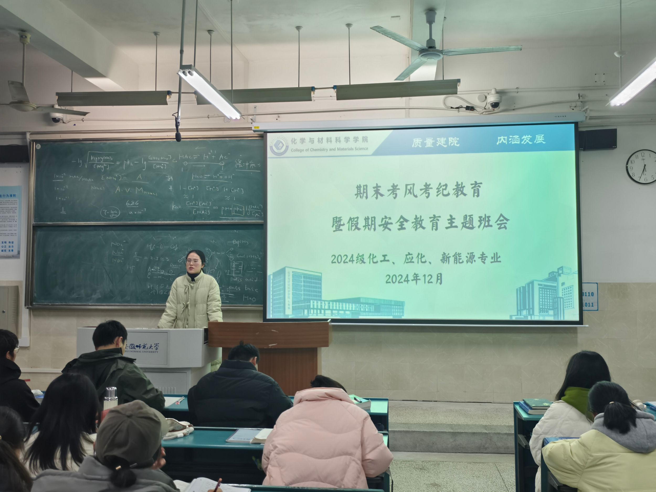 本网讯(英国正版365官方网站李泽宇 王芳)为了迎接期末考试,强化同学们诚信考试意识,树立优良的学风,12月26日,2024级化工、新能源及应化三个专业在行知楼2010105、2010104教室先后召开了期末考风考纪教育暨假期安全教育主题班会。会议由辅导员王芳老师主持,2024级化工、新能源及应化全体同学参加。