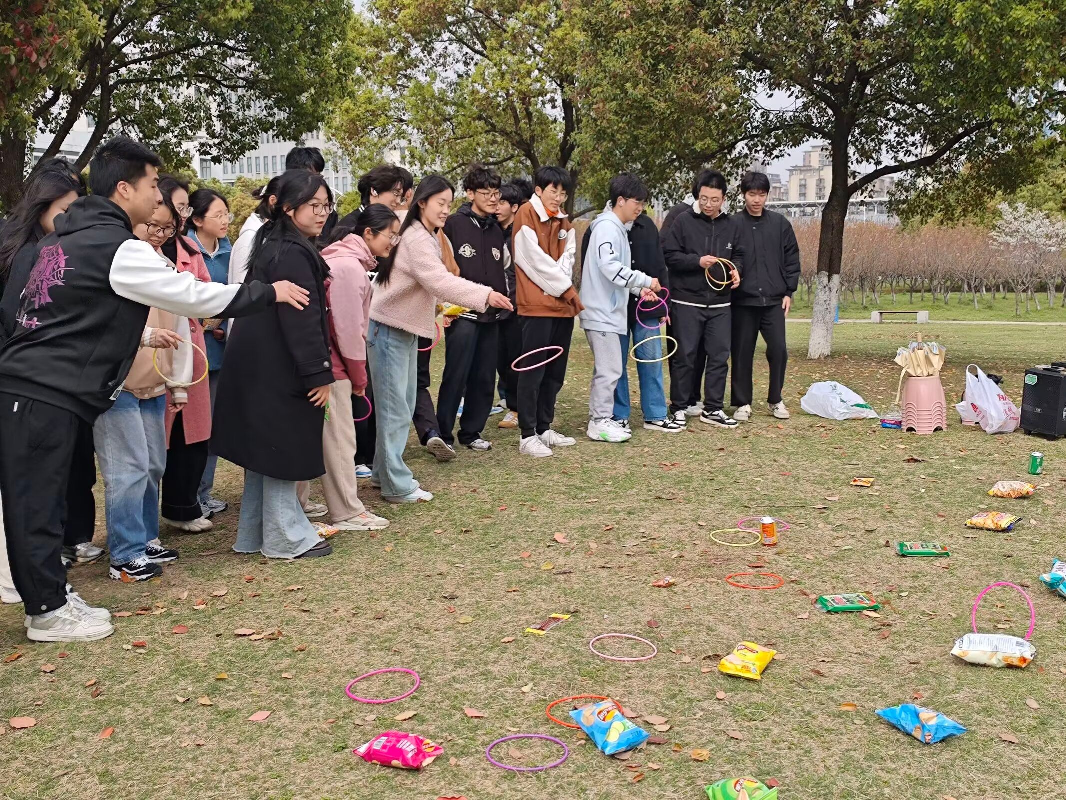 套圈游戏区域同样热闹非凡,精心准备的小礼品错落摆放,引得同学们跃跃欲试。大家手持套圈,灵活调动身体协调性,将圈套投掷到指定的位置。这一环节不仅让同学们收获了物质层面的小惊喜,更在鼓励与加油声中加深了同学间的情谊,营造出轻松愉悦、其乐融融的的活动氛围。
