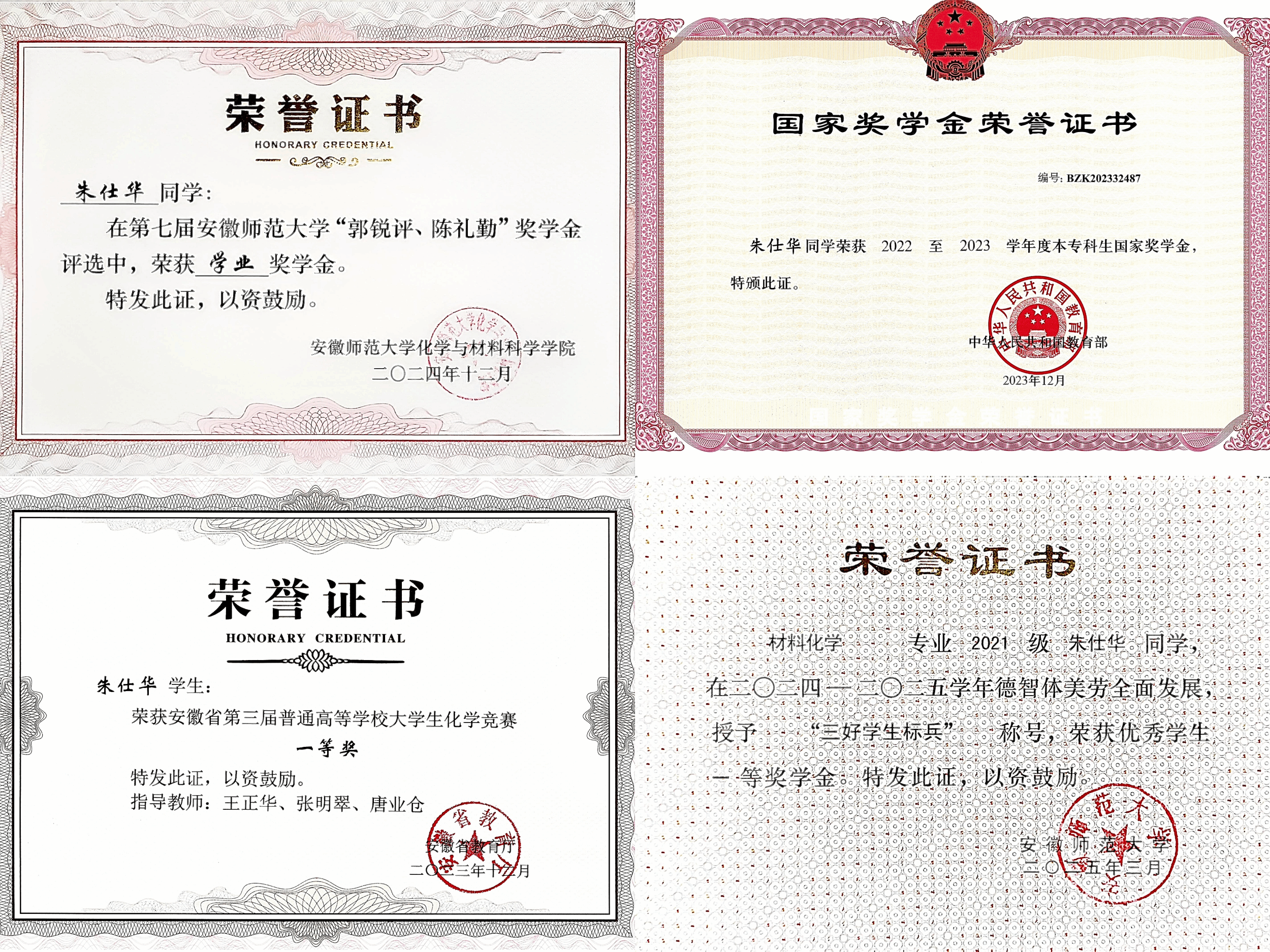 当X射线衍射仪的光斑在凌晨投射出金红石型TiO2的晶格参数时,朱仕华常常凝视着甲烷分子109°28′的完美键角陷入沉思——这个被写入教科书的稳定结构,恰似当代青年应有的科研姿态:既保持探索的锐角,又具备扎根的定力。GPA达到4.2,专业课成绩94.808分,35门专业课成绩90分以上,17门专业课绩点超过4.5,推免至中国科学技术大学是他坚实的“碳骨架”基石;国家奖学金、校一等奖学金、“陈礼勤、郭锐评”学业奖学金和科研达人奖学金是他稳定的“分子结构”构型;“三好员工标兵”“优秀员工干部标兵”“安徽省优秀毕业生”是他向外辐射的“分子间作用力”的注脚。