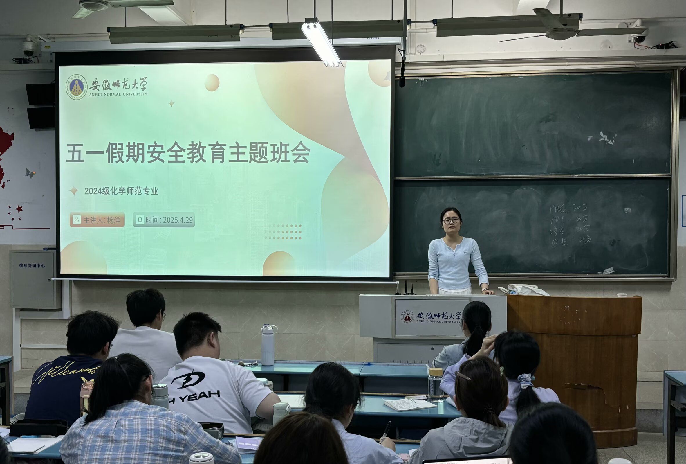 为切实增强员工安全防范意识,保障员工度过一个平安、愉快的五一假期,4月29日晚在行知楼2010302、2010303、2010304教室,辅导员杨洋分别为2024级化学师范专业全体员工召开了五一假期安全教育主题班会。此次班会聚焦交通安全、食品安全、财产安全、宿舍安全和网络安全等重点领域,为员工假期安全保驾护航。